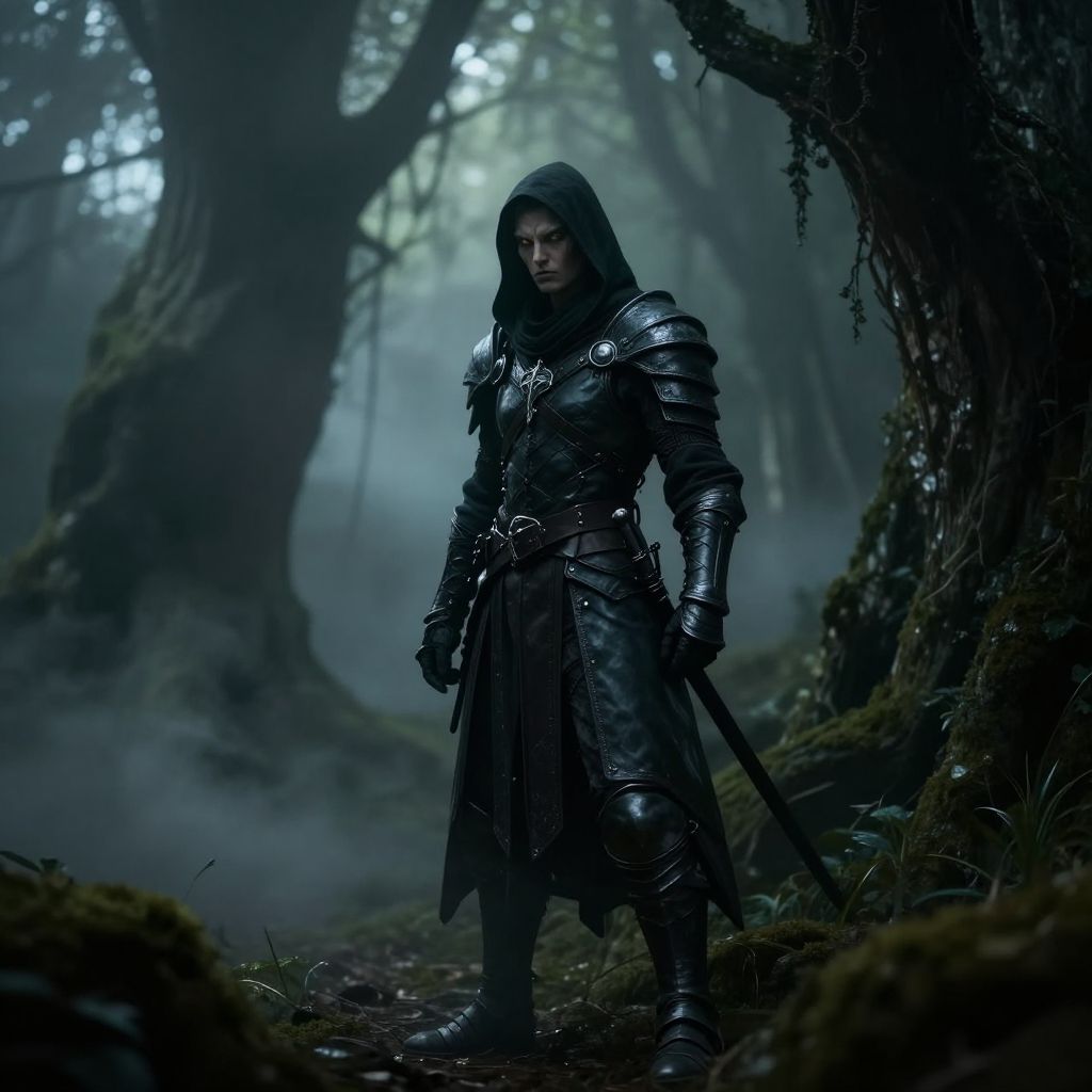 Photograph-like digital art of a stern, armored warrior in dark leather and steel with hooded cloak, standing in a misty, dark forest.