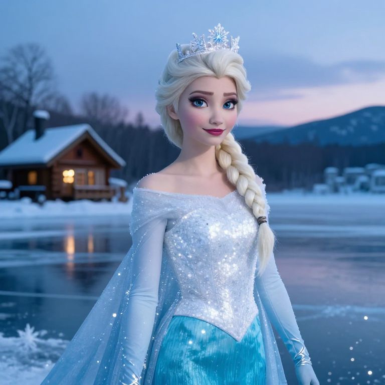 A high-definition photo of Princess Elsa from Frozen dressed as a winter princess in a sparkling white gown with icy blue trim, wearing silver gloves and a snowflake crown, posing on a frozen lake with ice crystals glittering under a twilight sky; she has fair complexion, platinum blonde hair, and icy blue eyes with a serene expression; the scene includes a cozy cabin in the background with warm lights