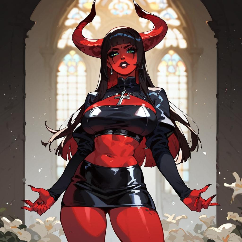 Score_9, score_8_up, score_7_up, score_6_up, score_5_up, score_4_up, demon woman standing in dark gothic church, red skin, horns, mini skirt & hooker makeup, (smudged red lipstick) black eyeshadow and red blush and black (dripping mascara)(Hime cut hair)(Smeared make up), (ruined make up), (smeared lipstick)
