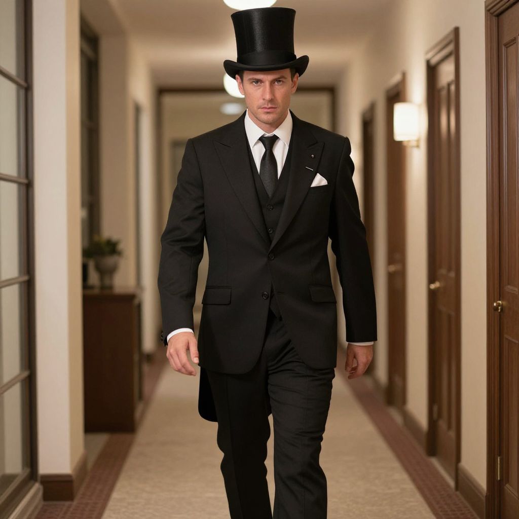 Photograph of a Caucasian man with a clean-shaven face, walking down a hotel corridor. He wears a black three-piece suit, white dress shirt, black tie, and a black top hat. A white pocket square is neatly folded in his left breast pocket. The corridor has beige carpeting, wooden doors on both sides, and white walls with dark trim. A small potted plant is visible in the background to the left. The lighting is warm, and the overall atmosphere is formal and sophisticated. The man's expression is serious and focused.
