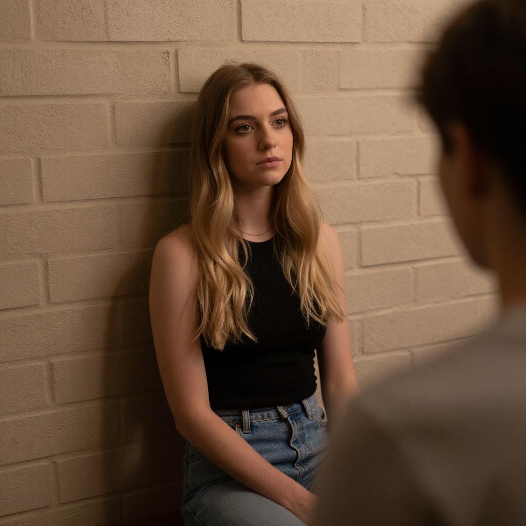 Photograph of a young woman with long, blonde hair, sitting in a dimly lit, blue-tinted room. She wears a dark, ured jacket and gazes slightly to the side with a calm expression. Blue light and smoke create a mysterious, ethereal atmosphere, highlighting her face and hair.