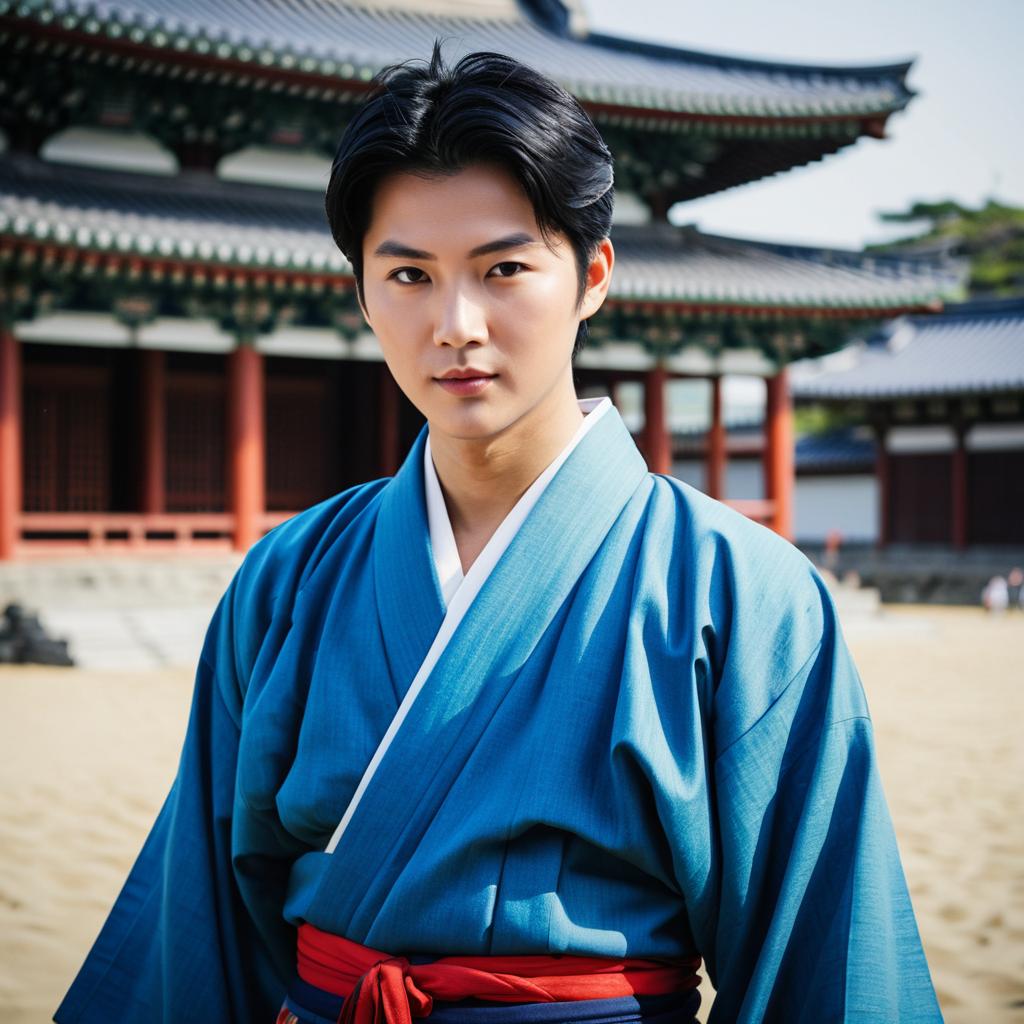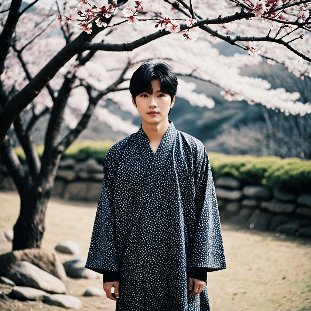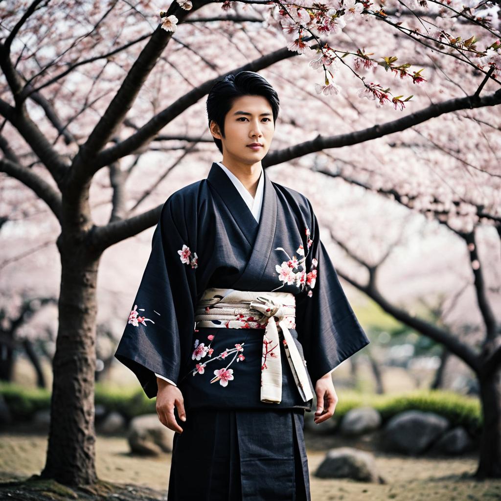 Young Asian Man in Pink Kimono with Cherry Blossoms
