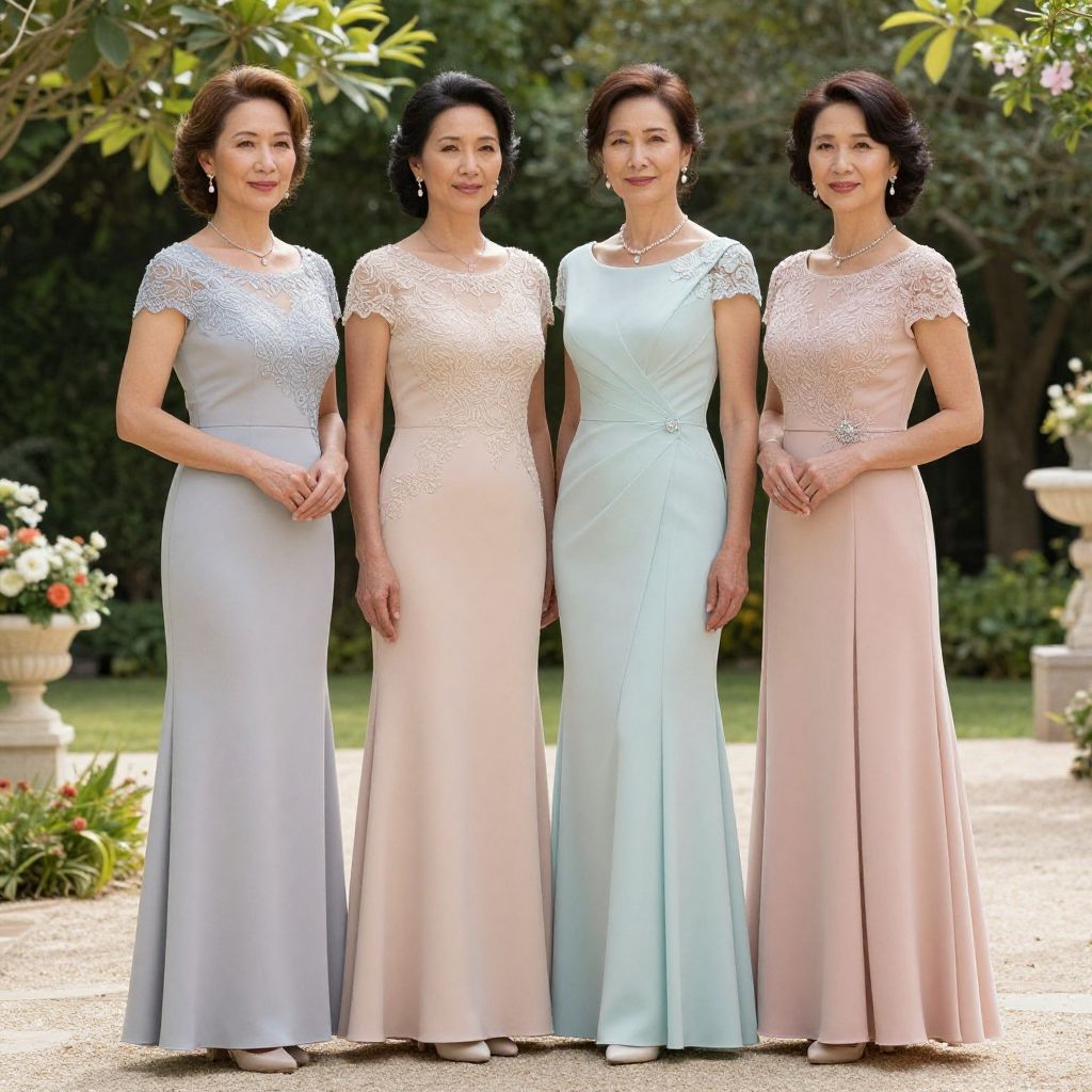 Photograph of five women in elegant, floor-length dresses—four in white, one in navy—standing in a sunlit forest, hands by their