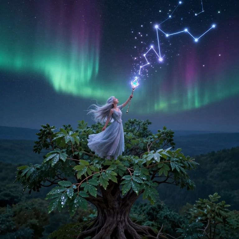 Photograph of a silhouetted fairy-like ballerina with translucent wings standing in a misty, reflective lake at night. Her arms are gracefully raised above her head, and she wears a white tutu. Above her, vivid green, purple, and blue auroras illuminate the starry sky. Silhouetted trees with twinkling lights frame the scene on the left, while dark trees form a natural border on the right. The water's surface mirrors the ethereal colors and the ballerina's reflection is visible. The overall mood is magical and serene.