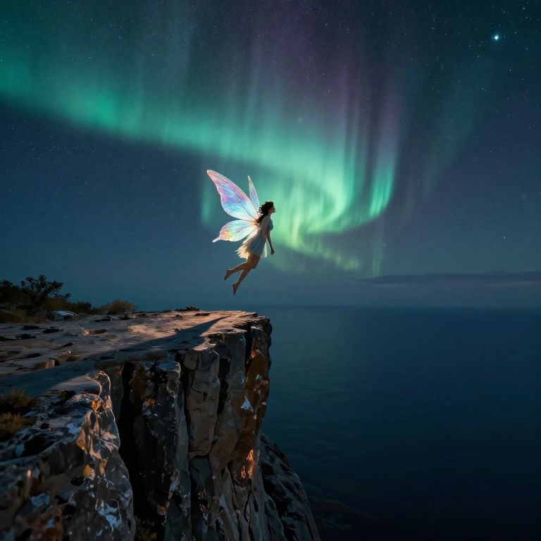 Imagine an enchanting ballet dancer in motion, her shimmering wings gracefully gliding through the air as she twirls across a foggy lake at dusk. The scene embodies both serenity and intrigue, painted in a dreamlike manner reminiscent of Simon Stalenhag's style, where a solitary figure dances between glowing trees that cast elongated shadows over the still water below. Her delicate form stands out against the backdrop of a vivid aurora borealis undulating across the sky above, creating a sense of awe and mystical allure as if pulled from the pages of an enchanted storybook.