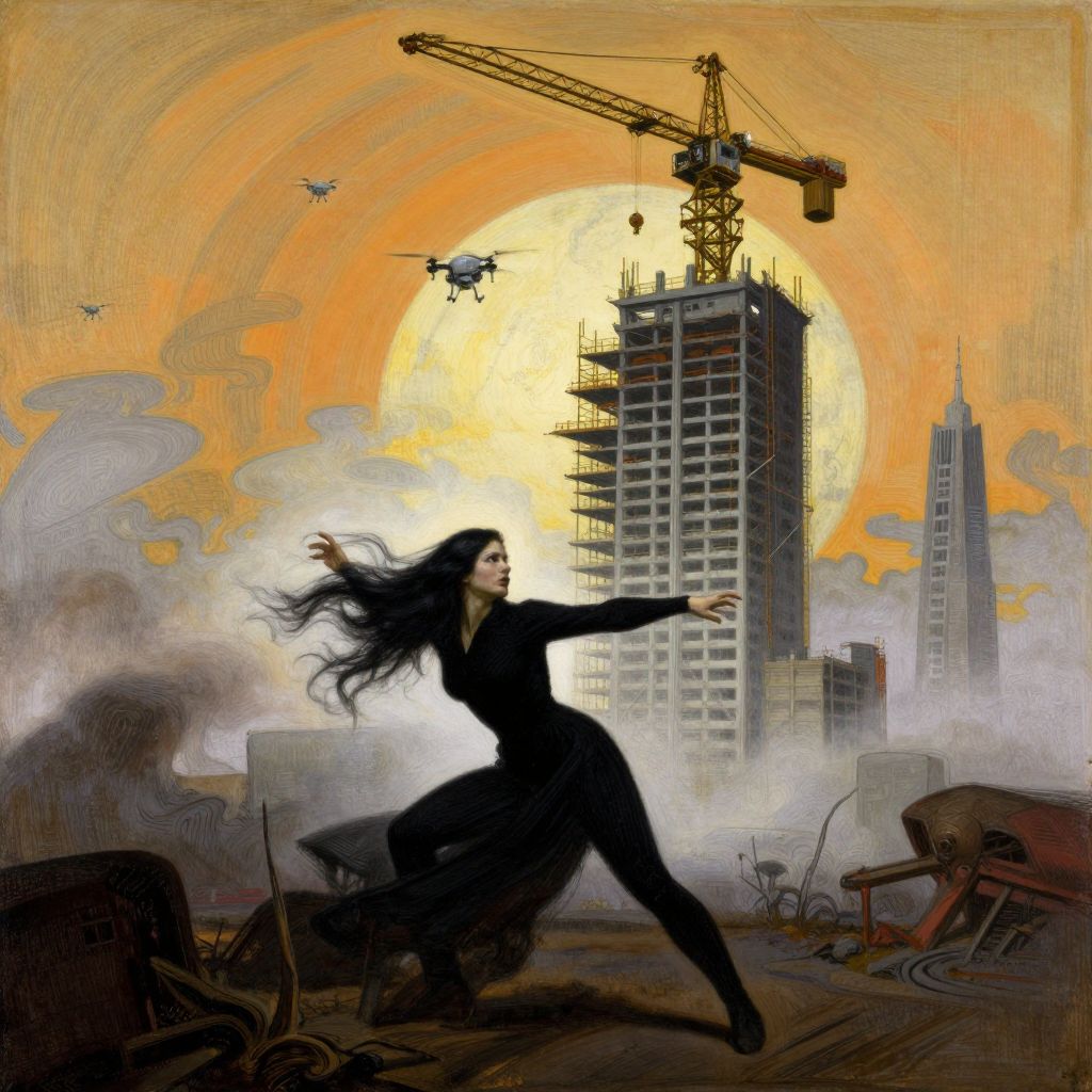 Digital artwork: Dark-haired woman in black suit, dynamic pose, urban apocalypse, large sun, crane, buildings, drones, debris, dramatic orange sky