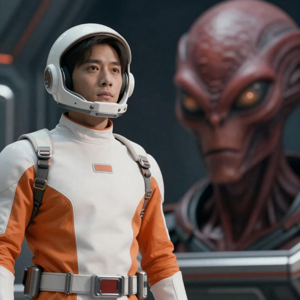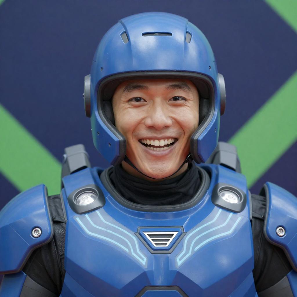 Photograph of a middle-aged man in a futuristic, gray and red armored suit with glowing orange accents. He has a serious expression, black background, helmet with a V-shaped center, and intricate shoulder designs. Upper body shot, centered.
