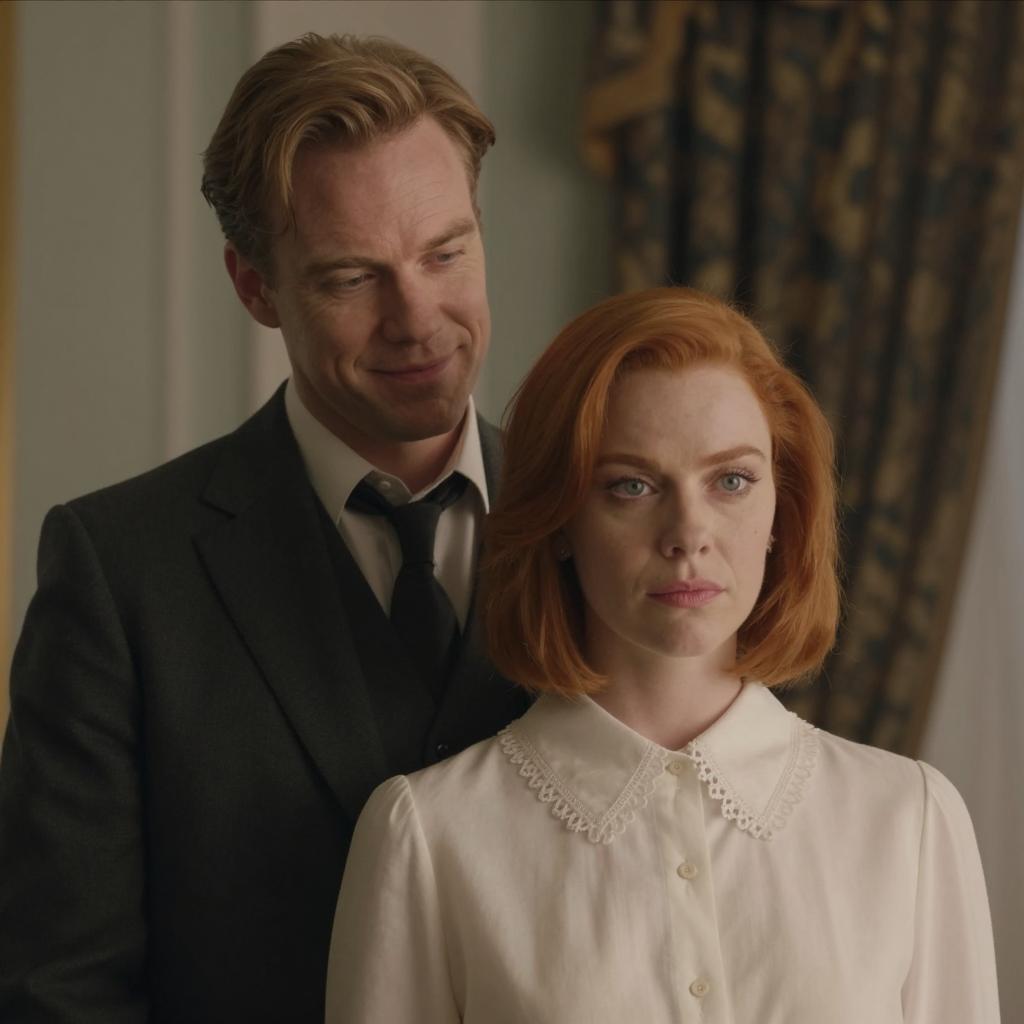 Two men in a bedroom. The taller man, wearing a dark suit and patterned tie, gestures with his right hand, smiling. The shorter man, in a gray blazer with a diamond-patterned tie, looks down with a neutral expression. The background includes a bed with a blue and yellow patterned blanket, a lamp, and decorative items on the wall. The door to the left is slightly open.