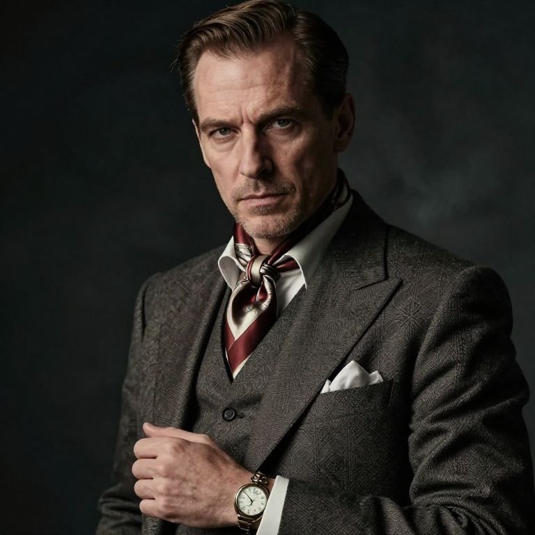 Senor in a dramatic portrait style, wearing a tailored suit with a silk scarf and vintage pocket watch, dark moody lighting with subtle smoke effect, classic old-world charm with a contemporary artistic twist.