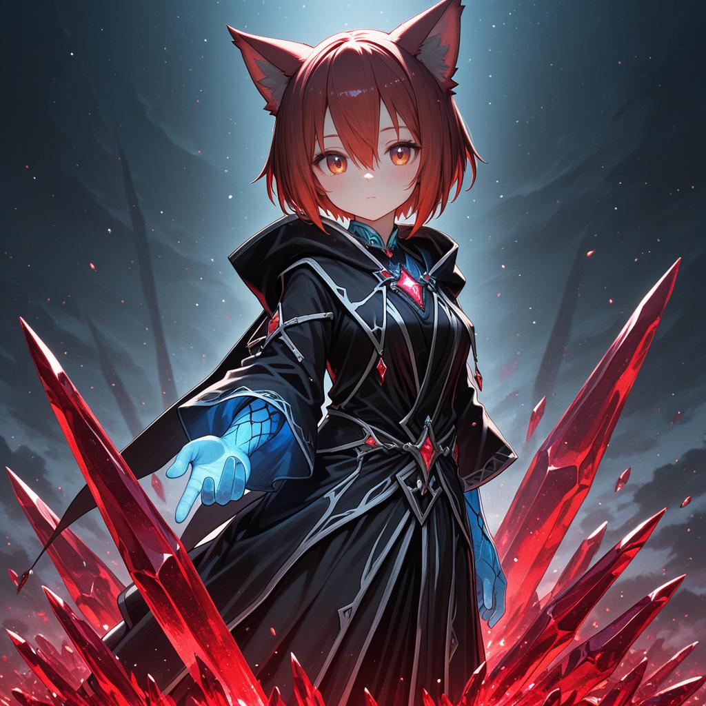 Crystal exarch, final fantasy, 1boy, cat boy, cat ears, red eyes, hair between eyes, slit pupils, red hair, short hair, hooded robe, black robe, hooded robe, black robe, hood down, miqo'te, material growth, facial mark, crystal, by artist kamonari ahiru, dark_illustrious