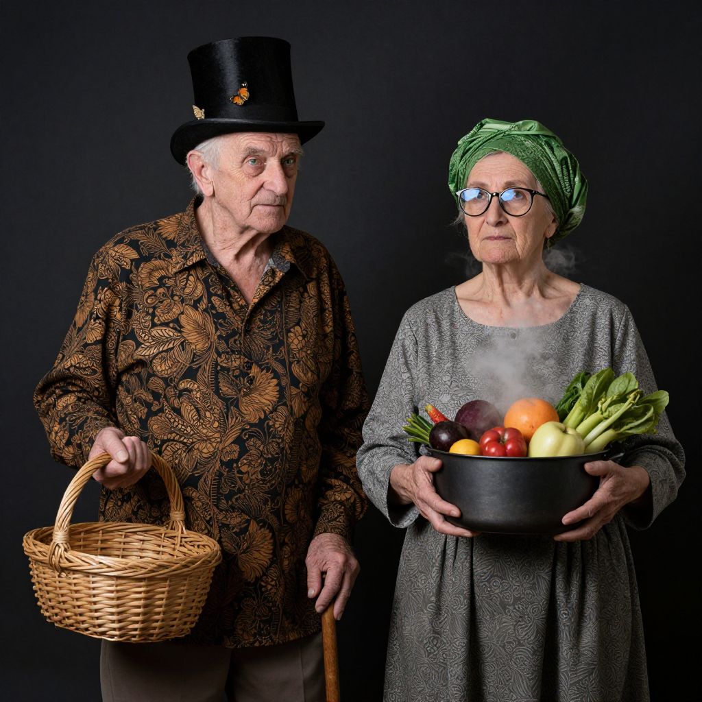 In this captivating image, two elderly individuals stand side by side, exuding an aura of wisdom and mystery. The man, adorned in a tall, dark top hat and a richly patterned shirt, holds a cane and a woven basket, suggesting a connection to the earth and nature. His face is etched with lines of experience, and a small butterfly rests on his hat, adding a touch of whimsy. The woman, dressed in a flowing green headwrap and a simple yet elegant dress, cradles a steaming pot filled with various fruits and vegetables, hinting at her role as a provider. Her glasses reflect a sense of knowledge and curiosity. Both figures stand against a dark, moody background, which accentuates their presence and the intricate details of their attire. The overall composition is balanced, with the man and woman positioned symmetrically, creating a harmonious visual narrative.