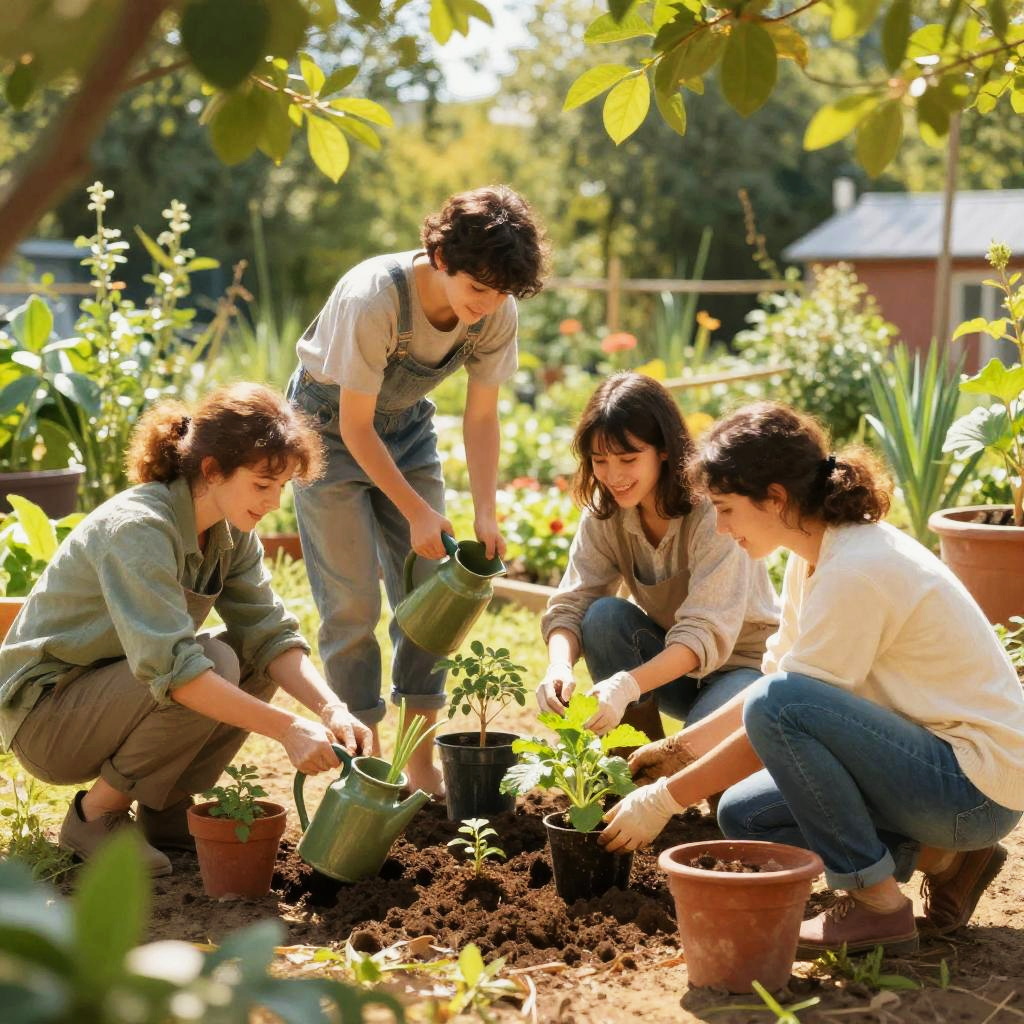 Participater depicted in an inspiring community garden setting, individuals planting and watering plants together, warm natural light filtering through leaves, harmonious color palette with lush greenery, soft painterly style emphasizing cooperation and growth.