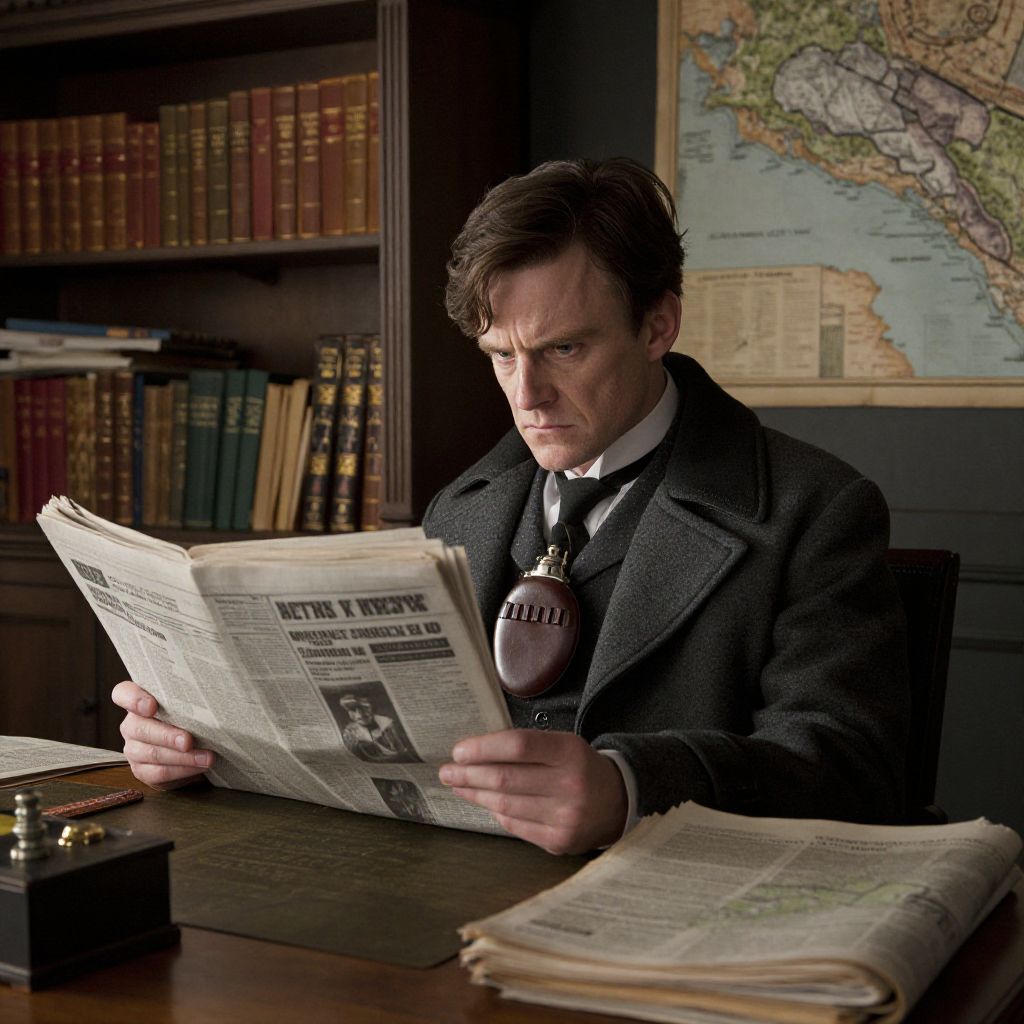 A dramatic scene shot in a dim basement library of a historical estate, showing a man fully dressed as Thomas Shelby, wearing the signature suit, a long coat, and a leather canteen, sitting at a wooden desk reading a newspaper, his facial features are defined with a stern look, strong nose, and deep lines around his eyes showing intelligence and hidden menace, the room is filled with dusty books and old maps.