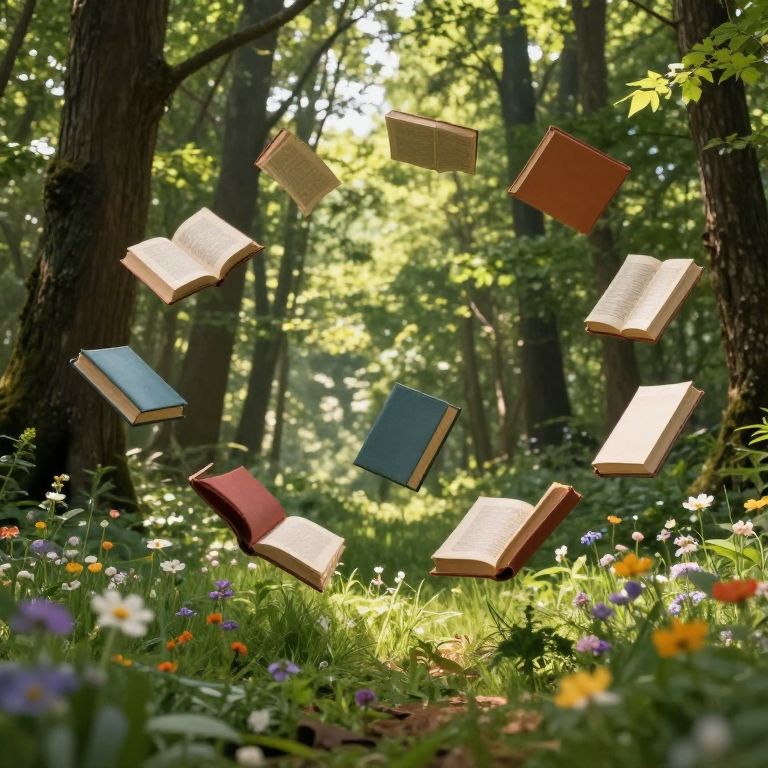 In a serene woodland, books of various hues defy gravity, suspended mid-air amidst the dappled sunlight and blooming wildflowers, creating a whimsical scene where knowledge and nature intertwine in a dreamlike dance.