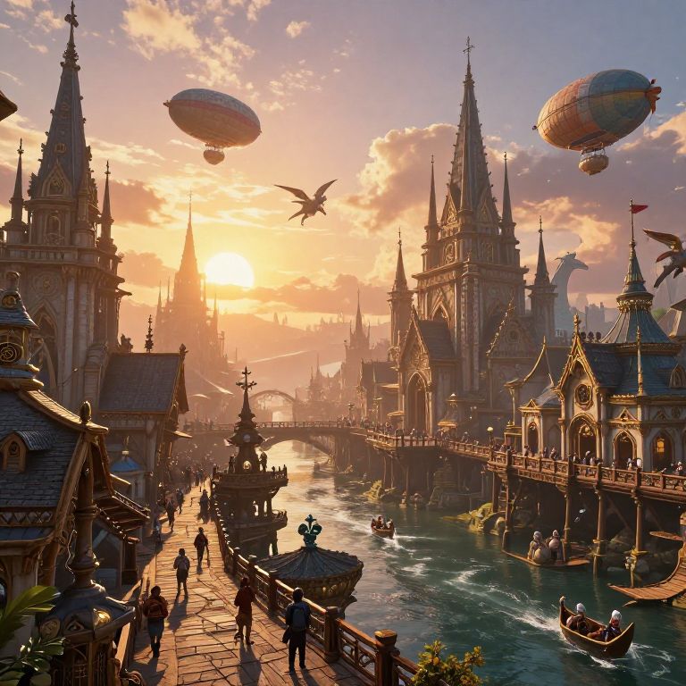 Fantasy port city art bustling with towering spires and intricate wooden docks under a glowing sunset, filled with airships and mythical creatures, vibrant colors, detailed textures, and a magical atmosphere inspired by steampunk and medieval architecture.
