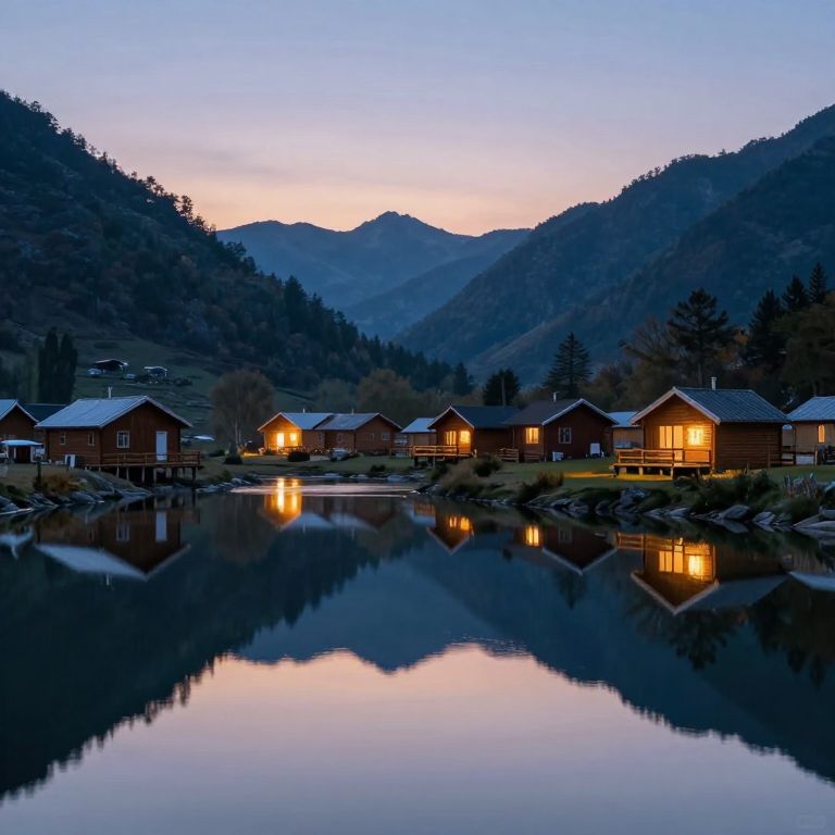 Twilight bathes a serene valley in ethereal light, where scattered wooden cabins emit warm glows that mirror perfectly in the tranquil waters below, creating a surreal landscape where reality and reflection blur into impossible harmony.