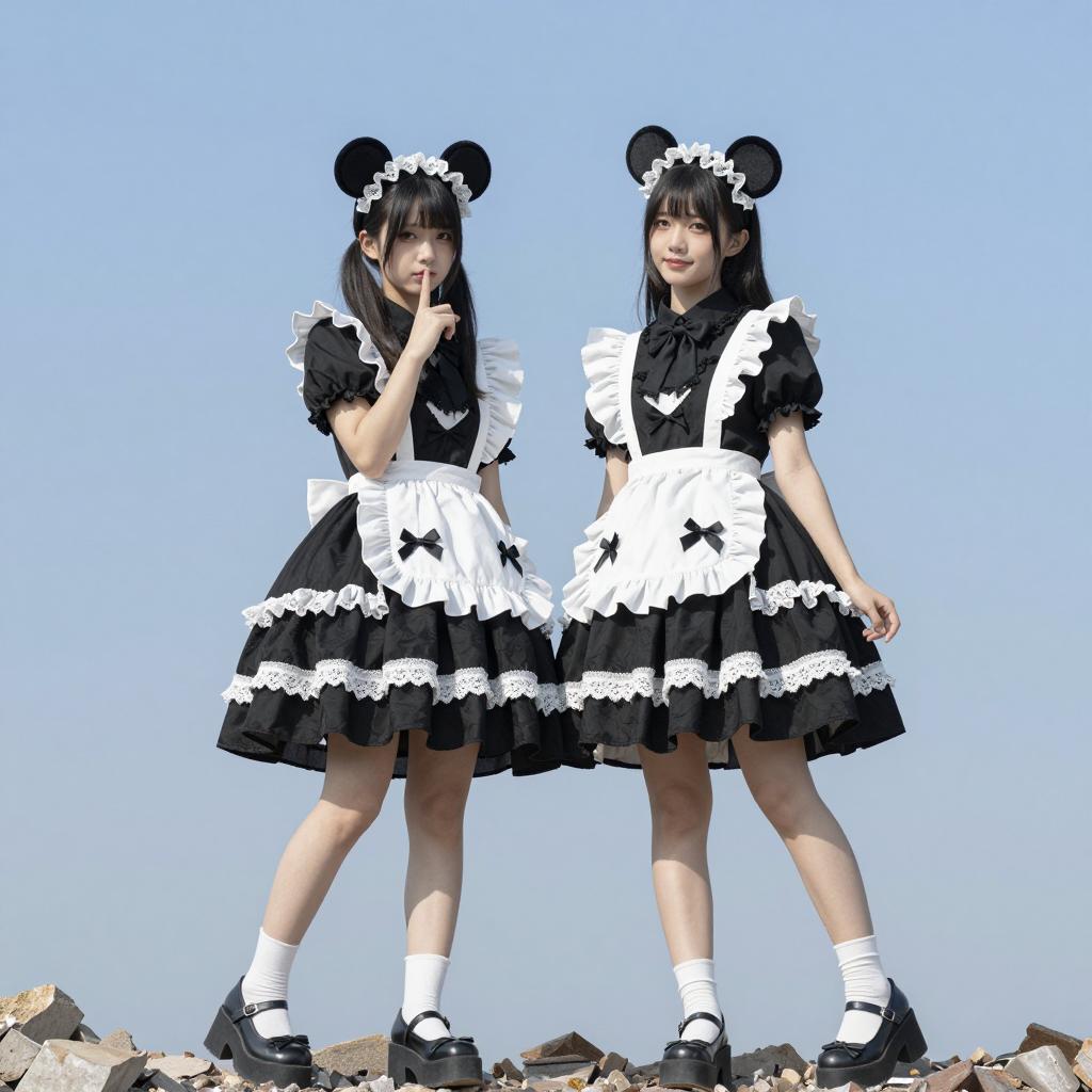 Two young women in black and white French maid outfits with bows and frills stand in a rubble-strewn outdoor area. They have pale skin, black hair, red lipstick, and wear white lace stockings and black Mary Jane shoes. Both have pigtails and wear lace-trimmed aprons with striped ribbon details. The woman on the left has her hand on her hip, while the woman on the right stands with her hands behind her back. The background shows a clear blue sky and partially visible urban buildings.