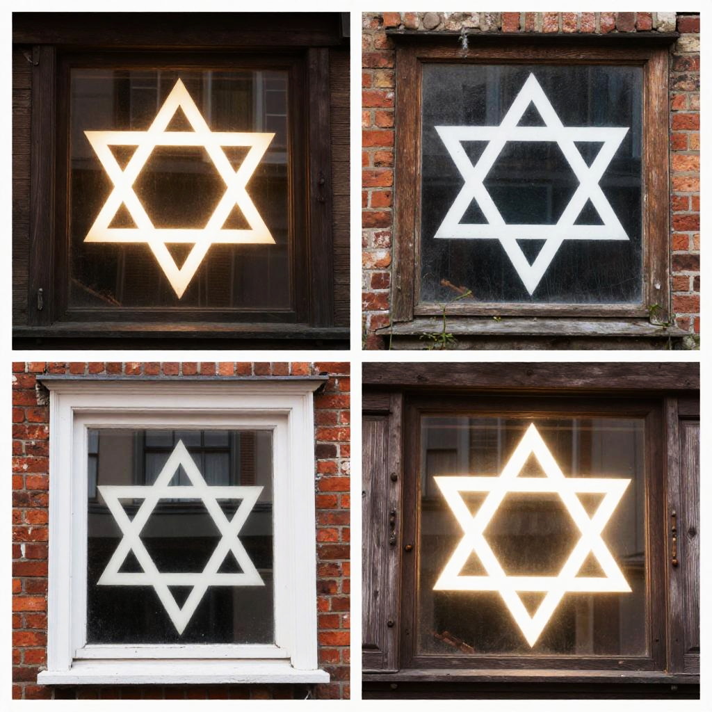 This photograph showcases a collage of four images, each featuring a glowing white Star of David (six-pointed star) illuminated from behind against dark, rectangular window panes. The windows are set in red brick walls, with three showing dark wooden frames and one with a white frame. The glowing star's brightness contrasts sharply with the dark backgrounds, creating a striking visual effect. The textures of the bricks and wood add a rustic element, while the glowing star adds a modern, almost ethereal touch to the scene.