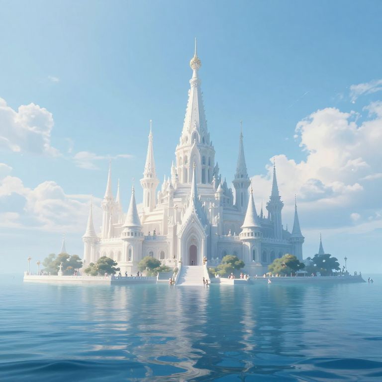 An ethereal 3D-rendered fantasy landscape depicts a majestic castle perched atop an inverted mountain, seamlessly blending into a surreal ocean of solid air below, where colossal fish glide gracefully, creating a dreamlike, high-definition visual effect reminiscent of surrealist art.