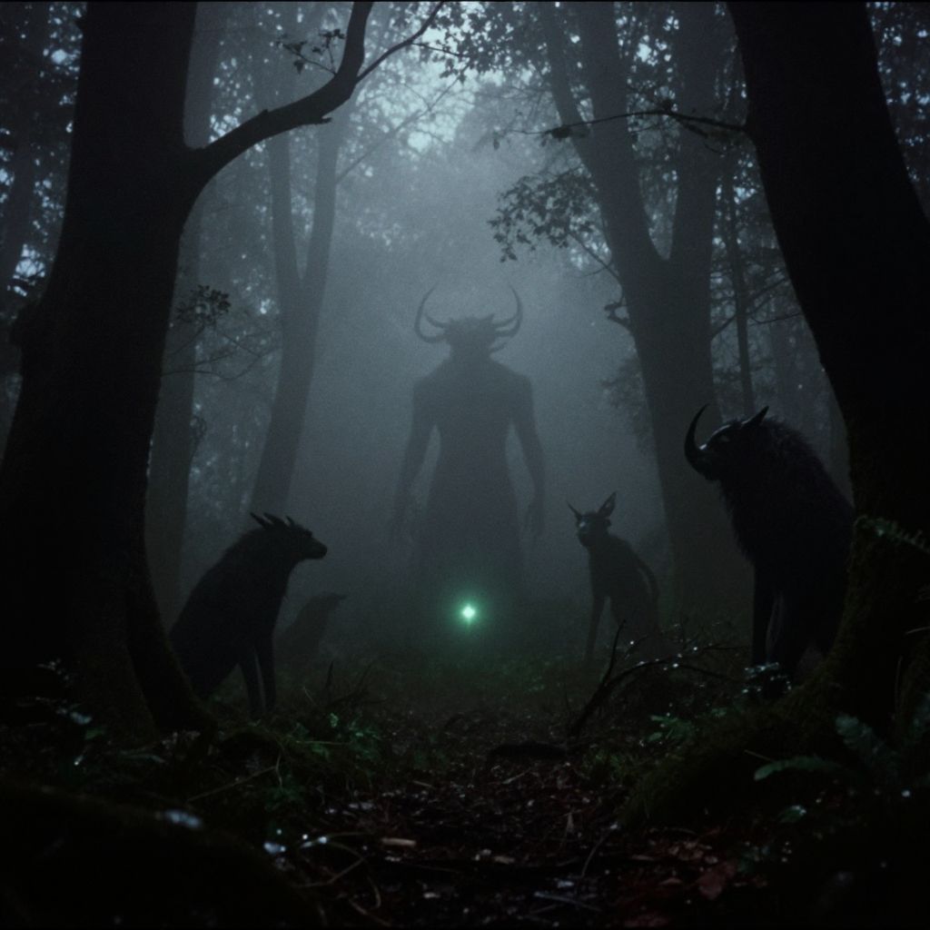 Dark fantasy movies 1980s theme, enchanted forest at twilight, mythical creatures lurking in fog, vintage grainy film texture, muted color palette with glowing magical elements