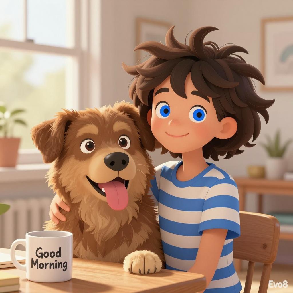 Digital illustration of a young girl with wild, spiky brown hair, blue eyes, and a smile, wearing a blue and white striped shirt, standing beside a fluffy, brown and tan dog with large eyes and a pink tongue hanging out. The girl's left arm rests on the dog's back. They are in a bright room with sunlight streaming through a window, a wooden table in the foreground, and a white mug on the table labeled "Good Morning." The dog's right paw is on the table. Artist's "Evo8" is in the bottom right.