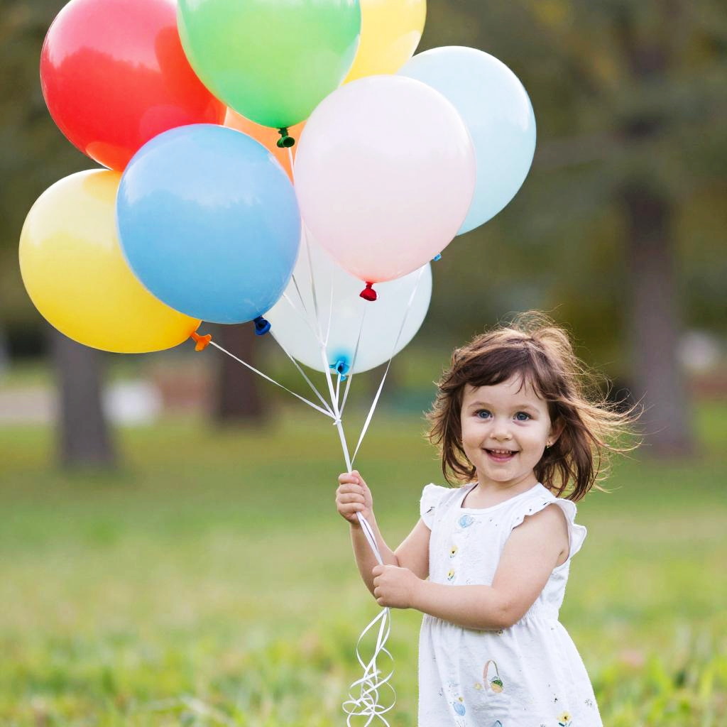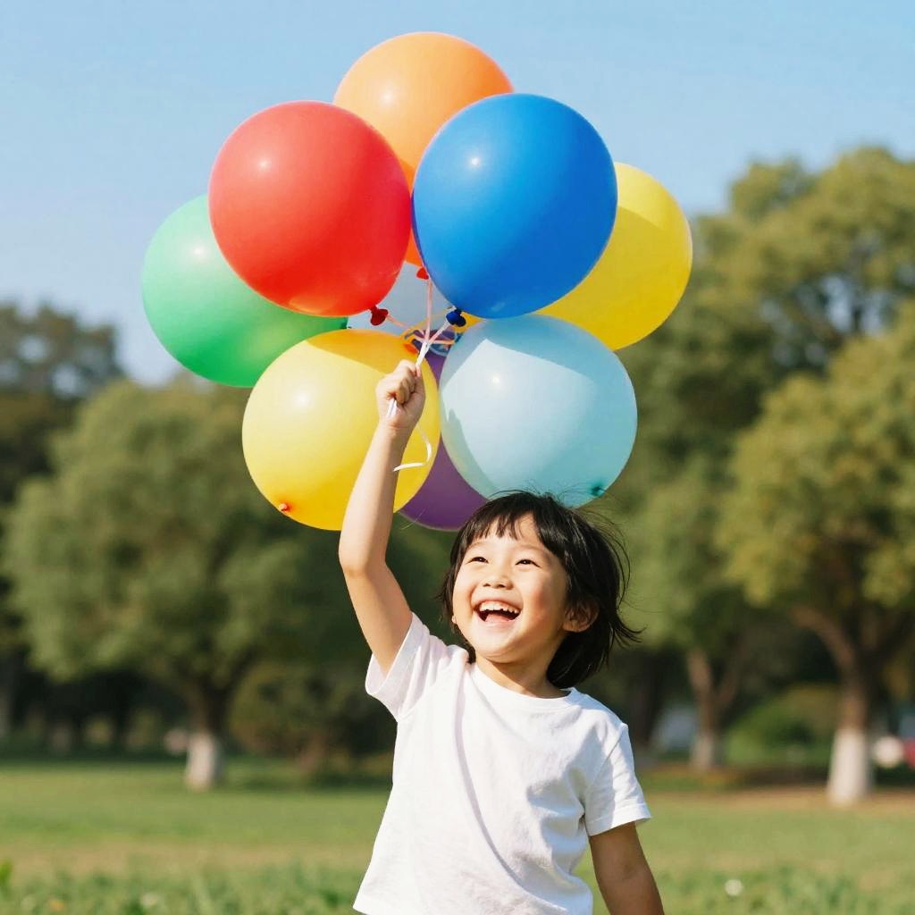 A vibrant smile on a child’s face while playing with colorful balloons in a sunny park, bright blue sky, soft focus background with green trees, joyful innocence and playful energy captured with vibrant colors and detailed expression