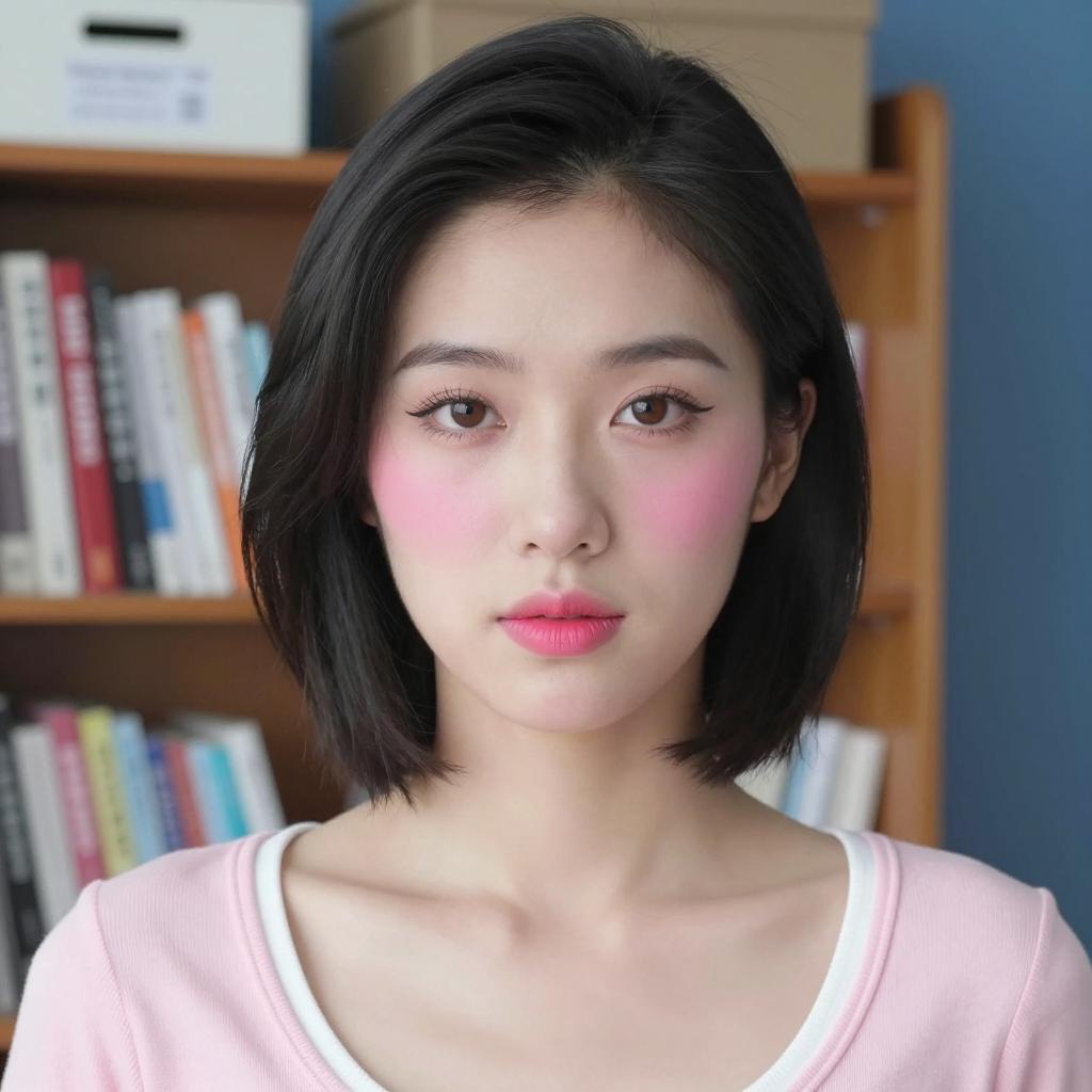 Close-up portrait of a young East Asian woman with short black hair, heavy black eyeliner, pink blush on her cheeks, and pink lipstick. She is wearing a pink top with white trim, standing indoors against a background of bookshelves filled with books and storage boxes, with a blue wall on the right side.