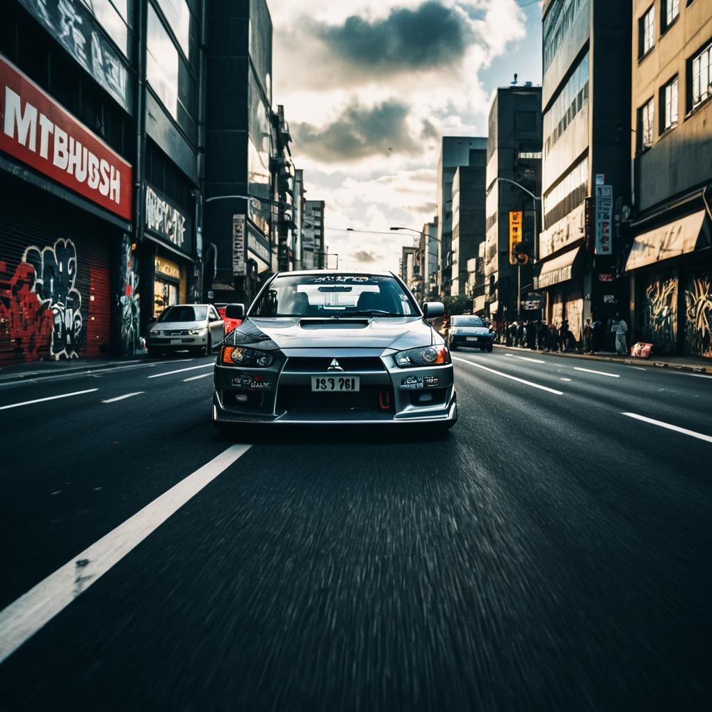 A cinematic shot of a tuned bmw car, drifting through traffic in a city atmosphere. there are nighttime city skyline far in the background down the road. In style of nfs most wanted. Ultra realistic reflections. Sunny and cloudy at 7 pm.