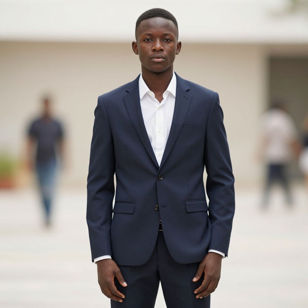 Photograph of a young Black man standing confidently in a well-lit outdoor setting. He has a short, neat haircut and is wearing a sharp, dark navy blue suit with a white dress shirt. His expression is serious and composed. The background is blurred, featuring indistinct figures and a white wall, creating a shallow depth of field that keeps the focus on him. The lighting is bright, enhancing the crispness of his suit and the contrast between his dark suit and white shirt. The overall style is modern and professional.