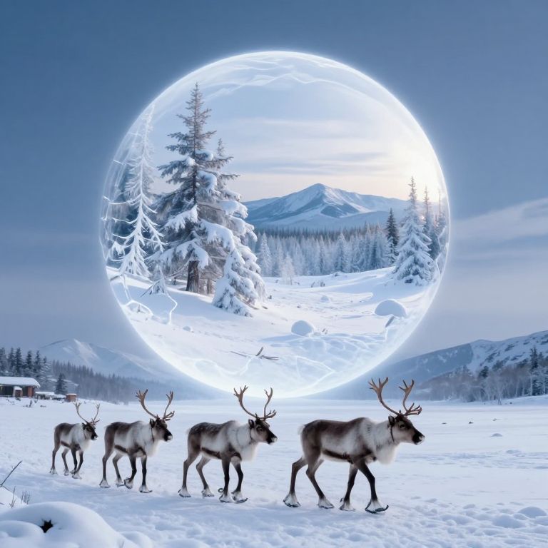 In a surreal winter landscape, reindeer adorned with snowshoes traverse the pristine snow beneath a colossal, luminous sphere that distorts the horizon, reflecting a fragmented, otherworldly vista of icy trees and distant mountains.