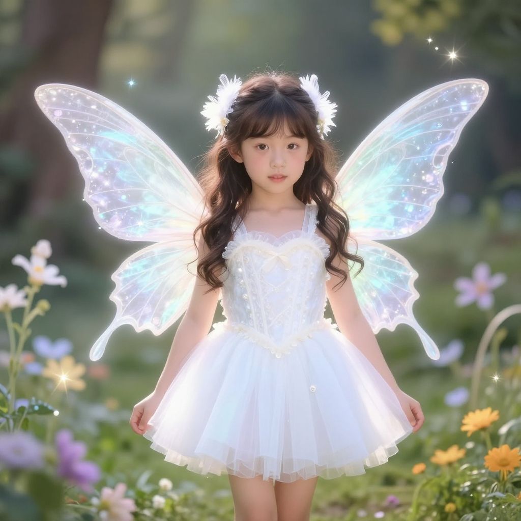 Photograph of a young Asian girl with long black hair, wearing a glowing white dress and illuminated fairy wings, standing in a sunlit, colorful me