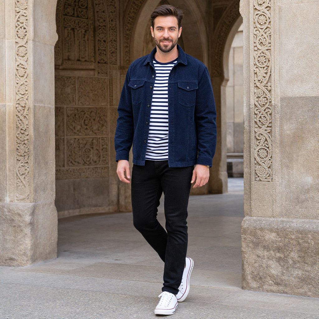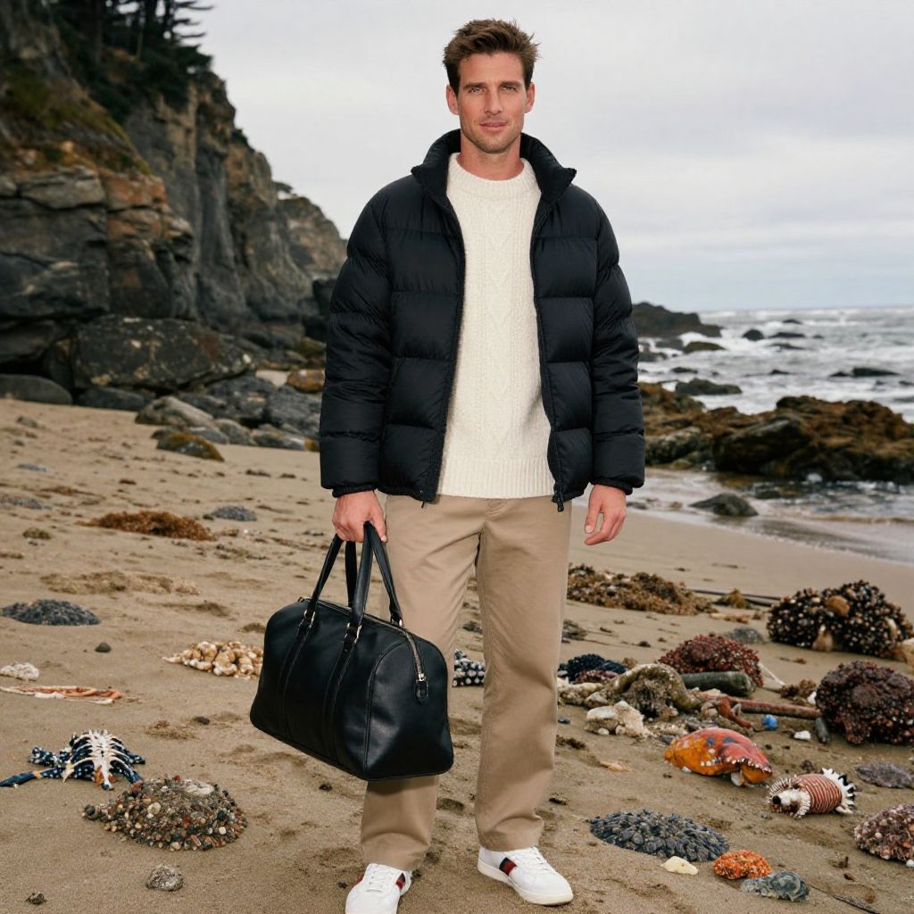 A man, heavyweight sweatshirt, slim-fit chinos, leather low-top sneakers, quilted vest, monochrome shades with a pop of neon, modern glass facade, bright blue postal box, urban park nearby, kodak sp analog photo, relaxed expression, casual confidence. Man has masculine face and piercing eyes