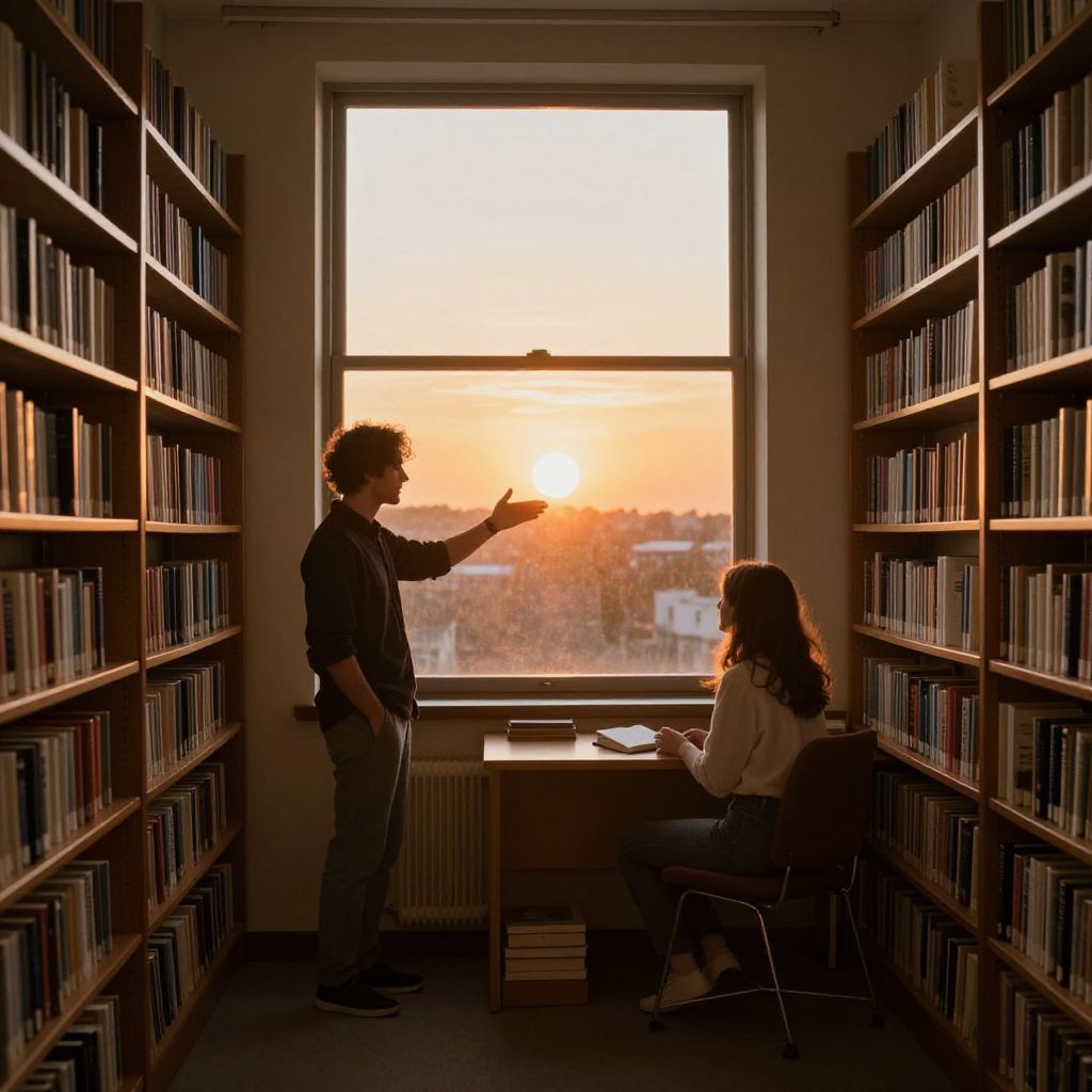 Silhouetted couple in library at sunset; man gestures, woman sits at desk, surrounded by bookshelves, warm orange light through window.