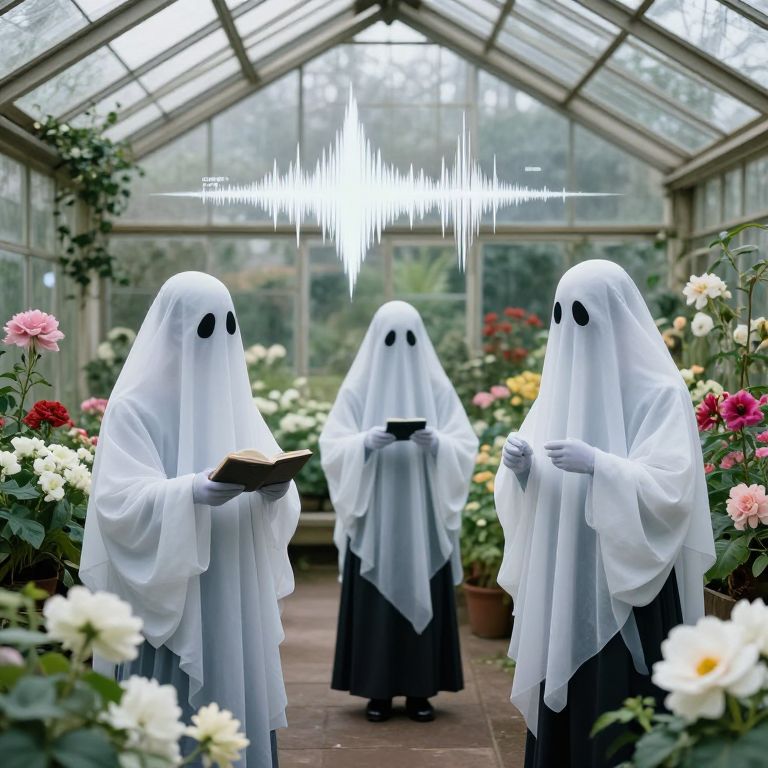 Ghosts in Victorian attire tend a glimmering greenhouse where flowers bloom exclusively in the colors of white noise and hum with forgotten radio frequencies.