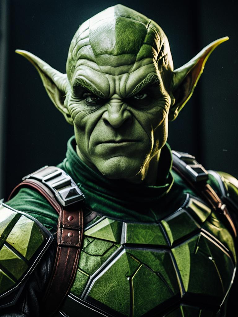 Close-up portrait of a man wearing a highly detailed, photorealistic Green Goblin costume from Marvel comics. The subject has green textured skin makeup with expressive orange eyes, pointed ears, and is dressed in a green and brown armored suit with metallic and leather-like details, showcasing cinematic realism.