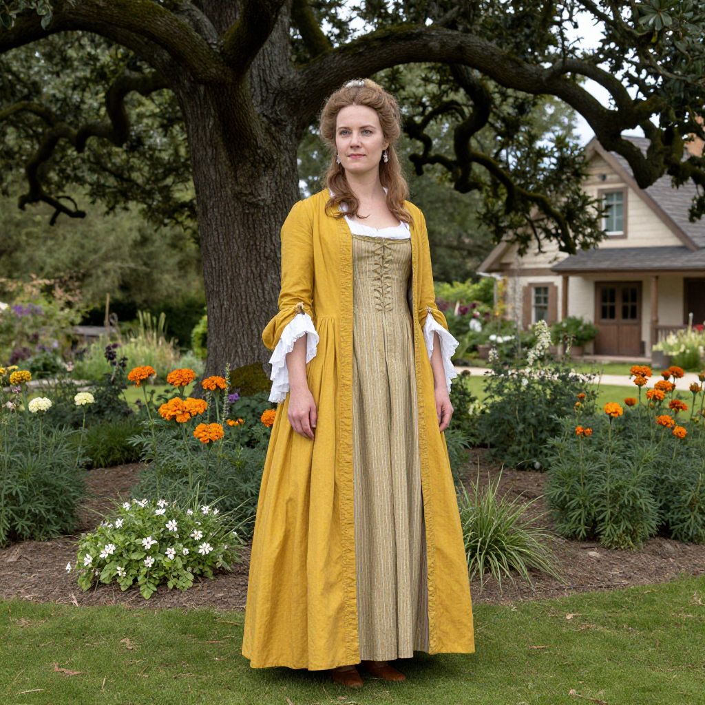 A woman in an 18th-century marigold dress stands in a garden, with an oak tree and a house in the background.