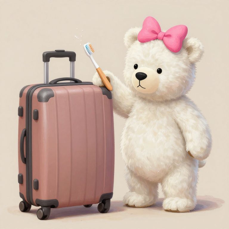Toothbrush Splatter in a painting style, a white baby bear with a pink bow on the head, and a huge luggage,