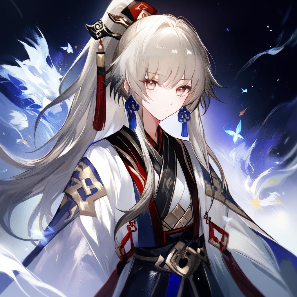 Archer (fate/samurai remnant), fate/samurai remnant, 1boy, yellow eyes, long hair, grey hair, streaked hair, white hair, tassel hair ornament, chinese hairpin, ponytail, high ponytail, sidelocks, hanfu, hanfu, by artist juexing (moemoe3345), animagine