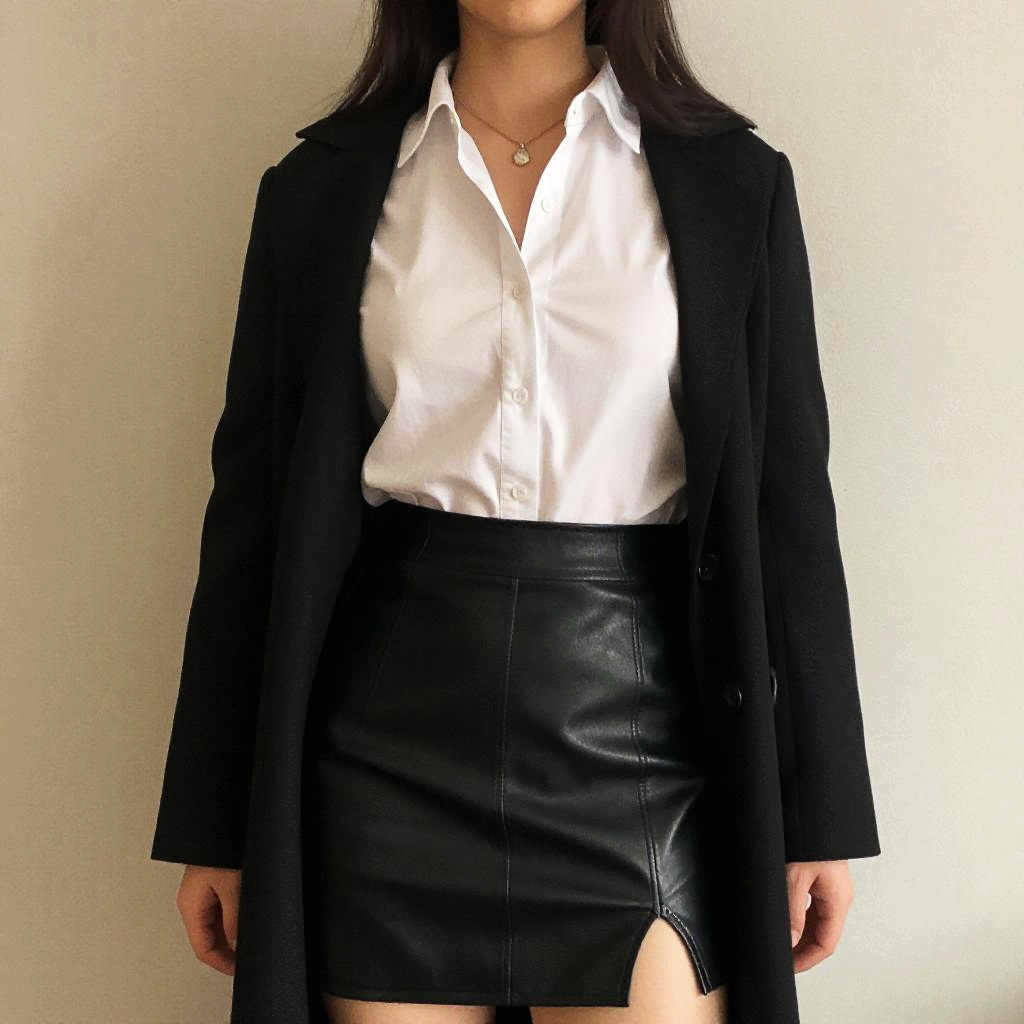 Photograph of a woman from the neck to the upper thighs, standing against a plain, light-colored background. She has long, dark hair and is wearing a black blazer over a white, slightly shiny, button-up shirt. The shirt is neatly tucked into a high-waisted, black leather skirt with a noticeable slit on the right side. She has a small, delicate necklace with a heart-shaped pendant. The textures of the blazer and skirt are contrasting, with the blazer appearing slightly matte and the leather skirt having a smooth, glossy surface. The overall style is professional yet edgy.