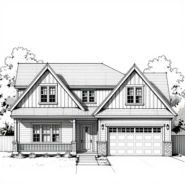A detailed black-and-white architectural sketch showcases a Craftsman-style home with a front elevation featuring a gabled roof, dormer windows, and a garage, rendered in a clean, hand-drawn style with precise lines and shading to highlight its classic design elements.