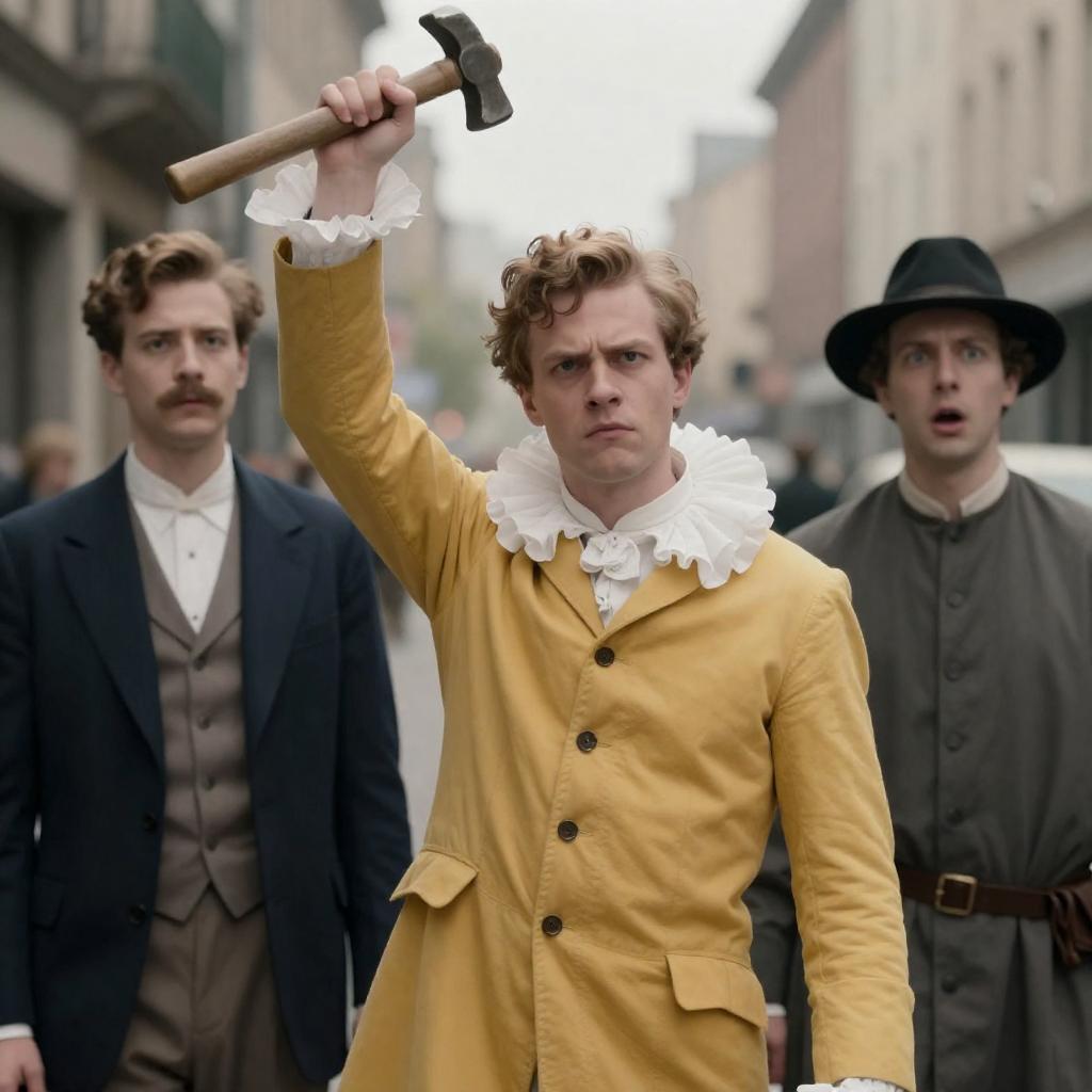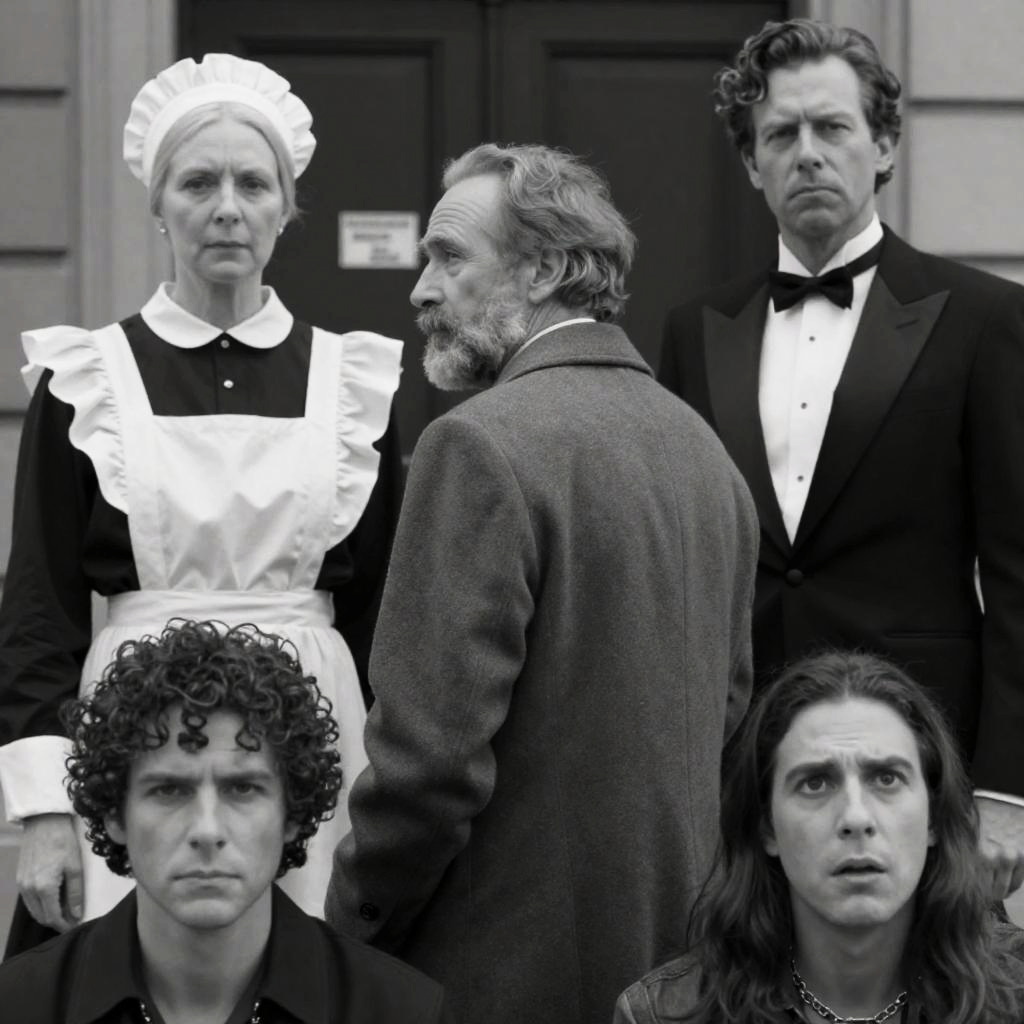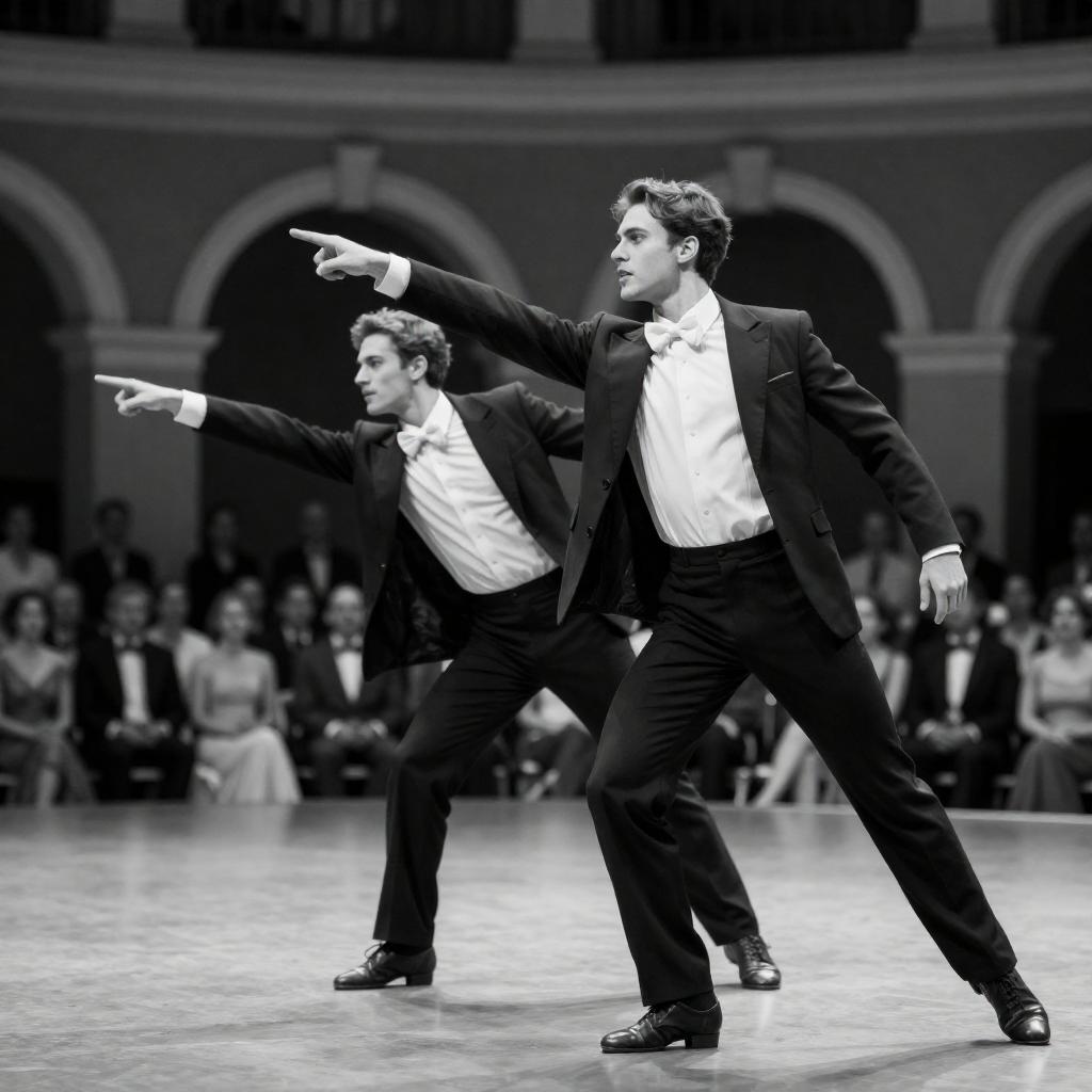 Black and white photograph of two men in striped Renaissance-style outfits with large collars and fringed shawls. One man holds a hat. They stand in a dimly lit room with wooden doors and windows in the background. Two blurred figures stand in the background. Both men have short hair and neutral expressions.
