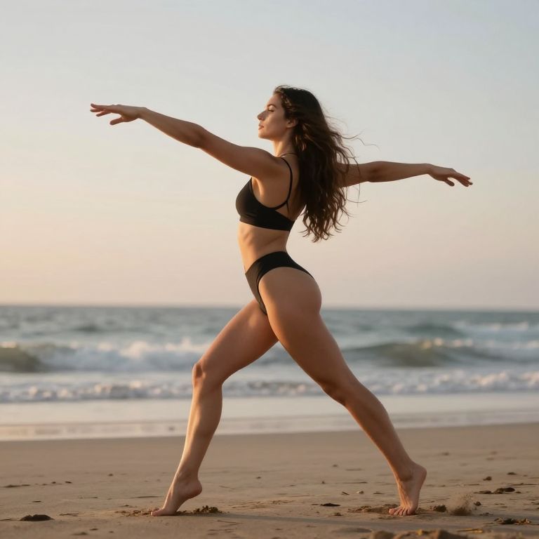 Photograph of a fit woman with long brown hair in a black bikini, striking a dynamic pose on a sandy beach with waves in the background at sunset