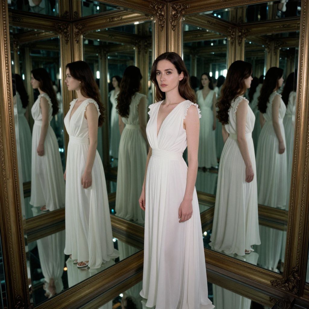 Reflections cascade endlessly through a series of ornate mirrors, revealing multiple versions of a woman in flowing white attire, her gaze fixed forward as if navigating a labyrinth of her own desires and dreams.