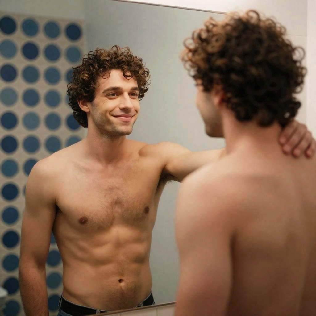 Photograph of two shirtless men with curly brown hair in a retro bathroom. The man on the left, facing forward, smiles slightly, with his arm around the neck of the man on the right, who is turned away. Mirror reflects the man on the left. Background has blue and white circular patterned tiles.
