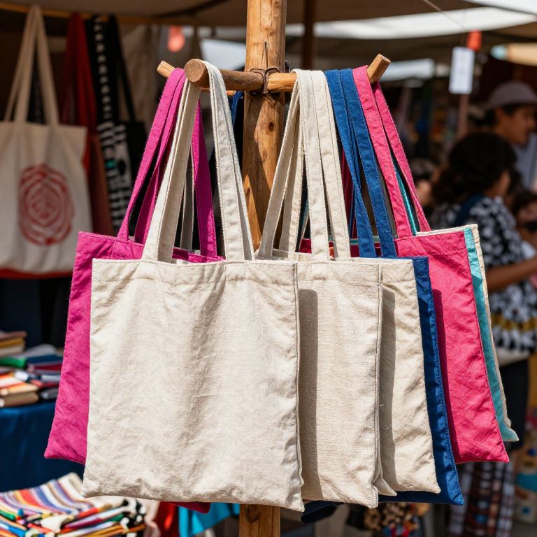 Photograph of colorful canvas tote bags (white, pink, blue) hanging on a wooden pole in a busy marketplace. Blurred background includes people and