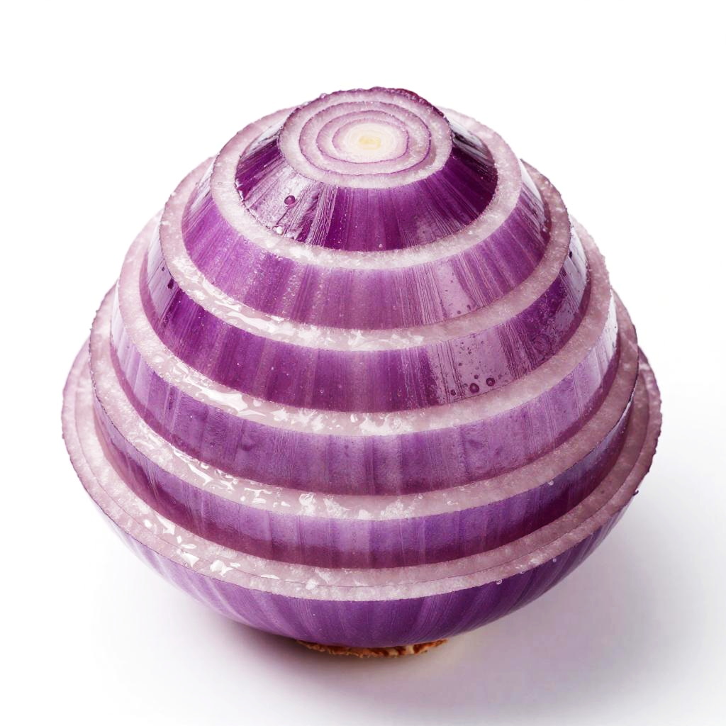 Photograph of a stack of six thin, translucent purple onion slices, arranged in a conical shape with the largest slice at the bottom and the smallest at the top. The slices have a shiny, wet texture with a rich, deep purple color. The background is stark white, making the onion slices stand out prominently. The lighting highlights the onion's glossy surface.