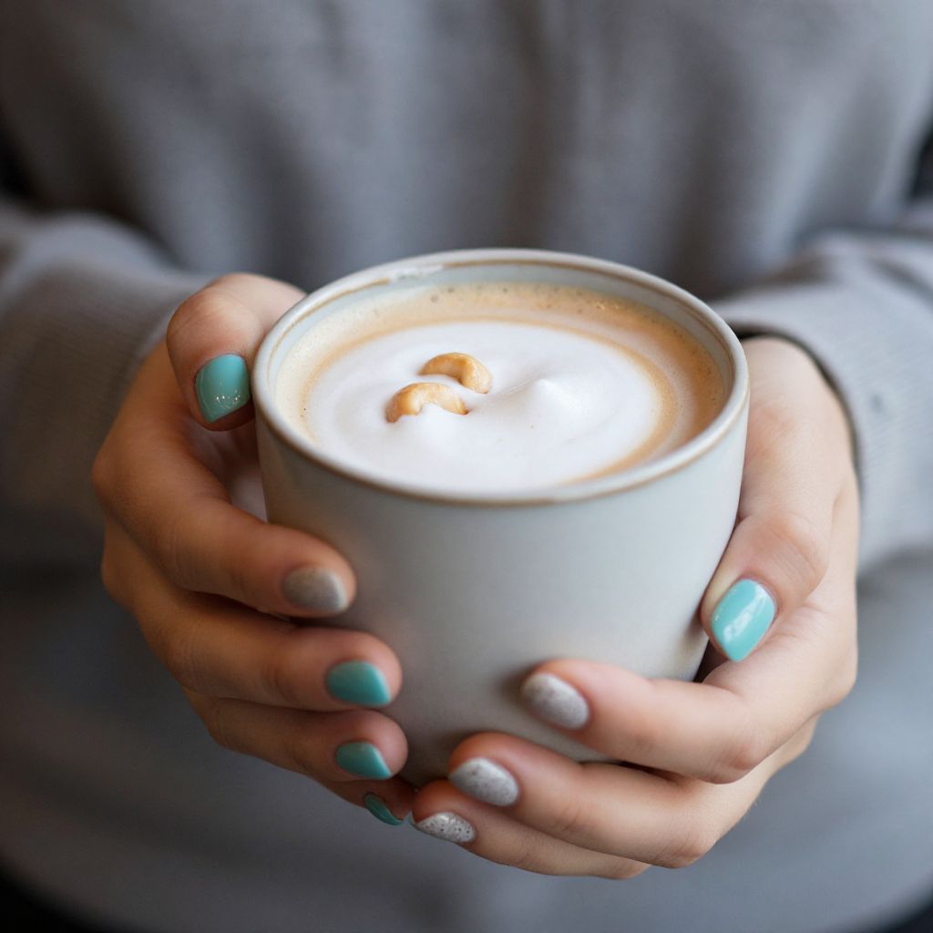 Woman holding ceramic mug with turquoise nail polish coffee to water ratio cashew latte with milk foam