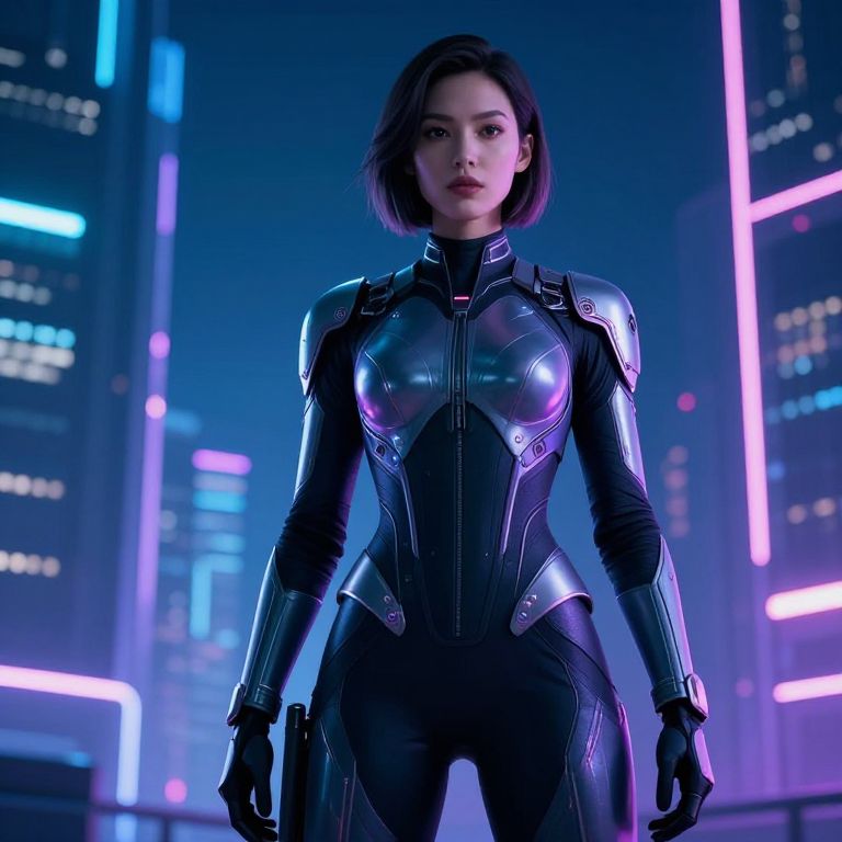 A futuristic female figure clad in a sleek, high-tech suit stands against a neon-lit cityscape, exuding confidence and a sense of readiness.