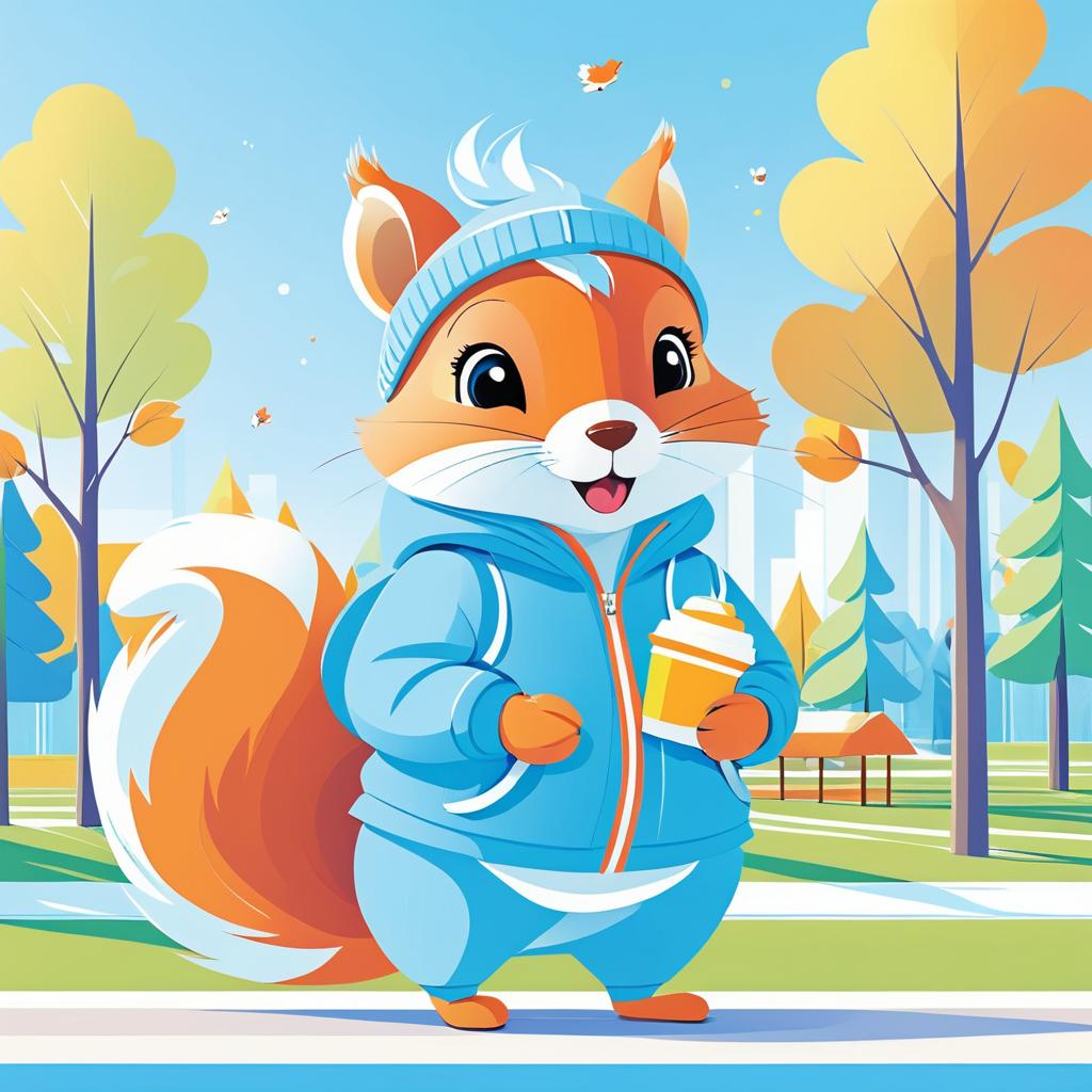 A 2D flat vector illustration of a cute and cheerful squirrel wearing a light blue jacket and leggings, sitting in a sunny park setting. The squirrel has big expressive eyes, a colorful bushy tail with orange and blue gradient shades, and a matching blue beanie with ear holes. The background consists of stylized green trees, a clear blue sky, and a bright sun, creating a vibrant and relaxed atmosphere.