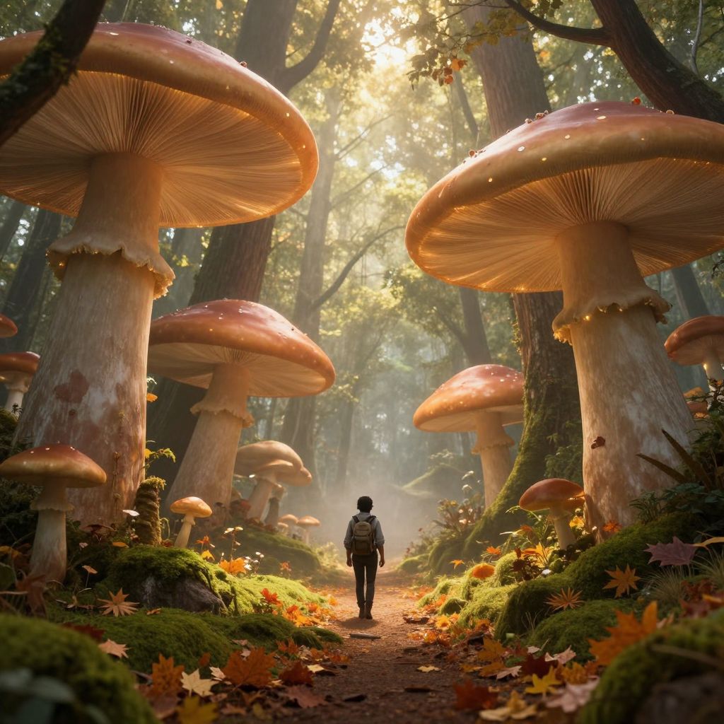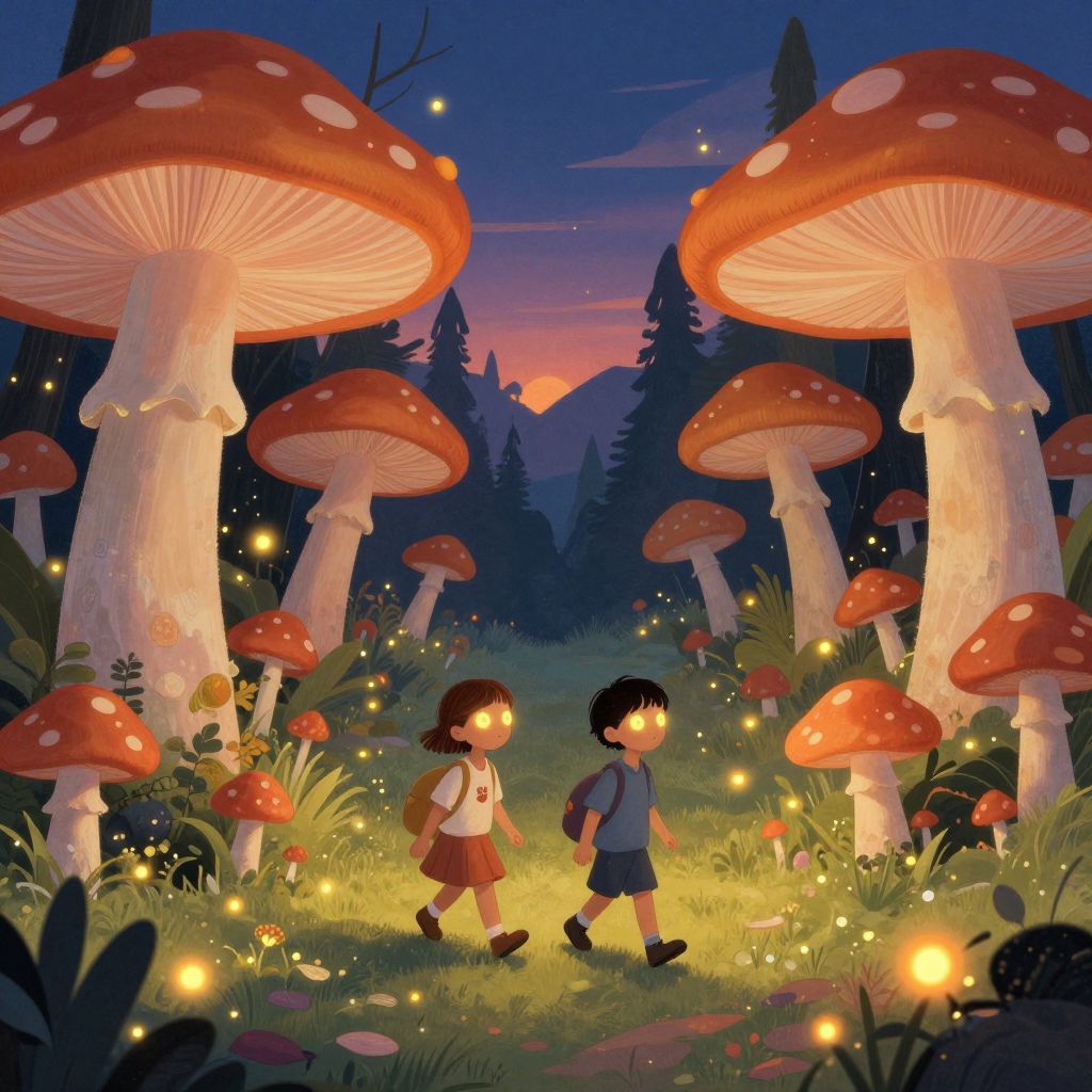 Digital artwork of two children with glowing mushroom hats walking through a magical forest of giant red mushrooms at twilight, surrounded by twinkling fireflies.